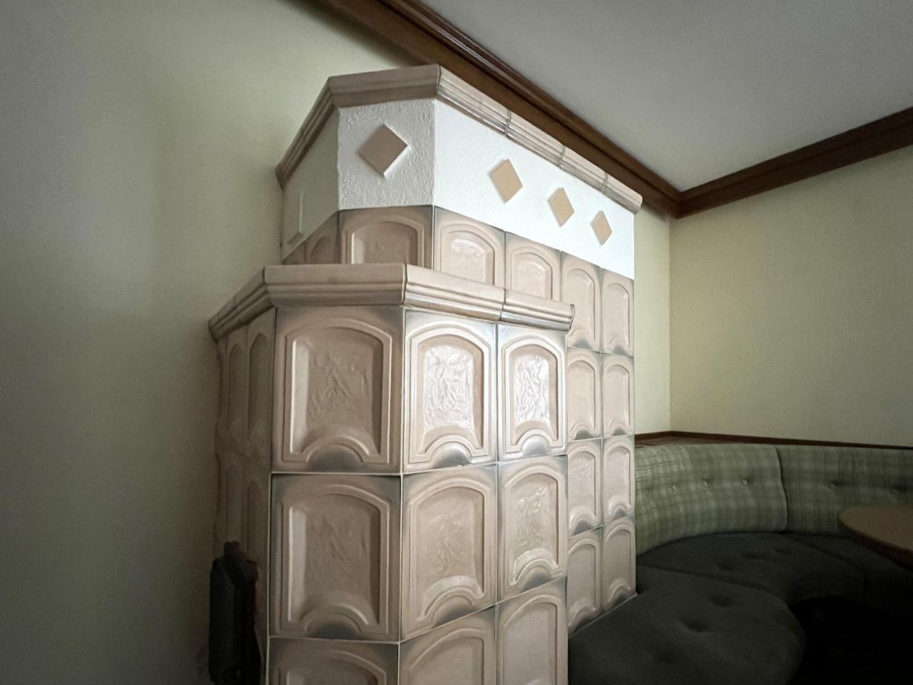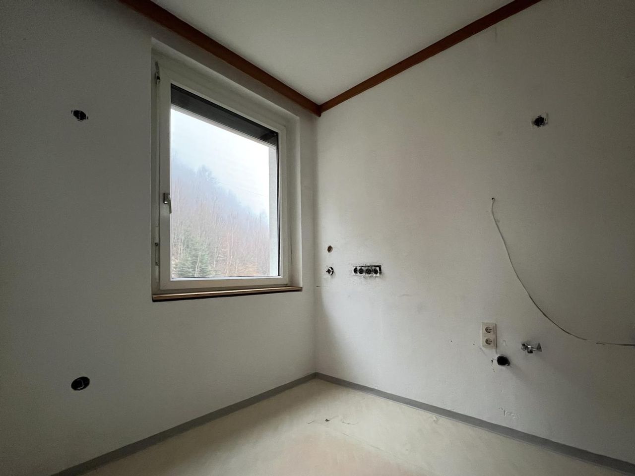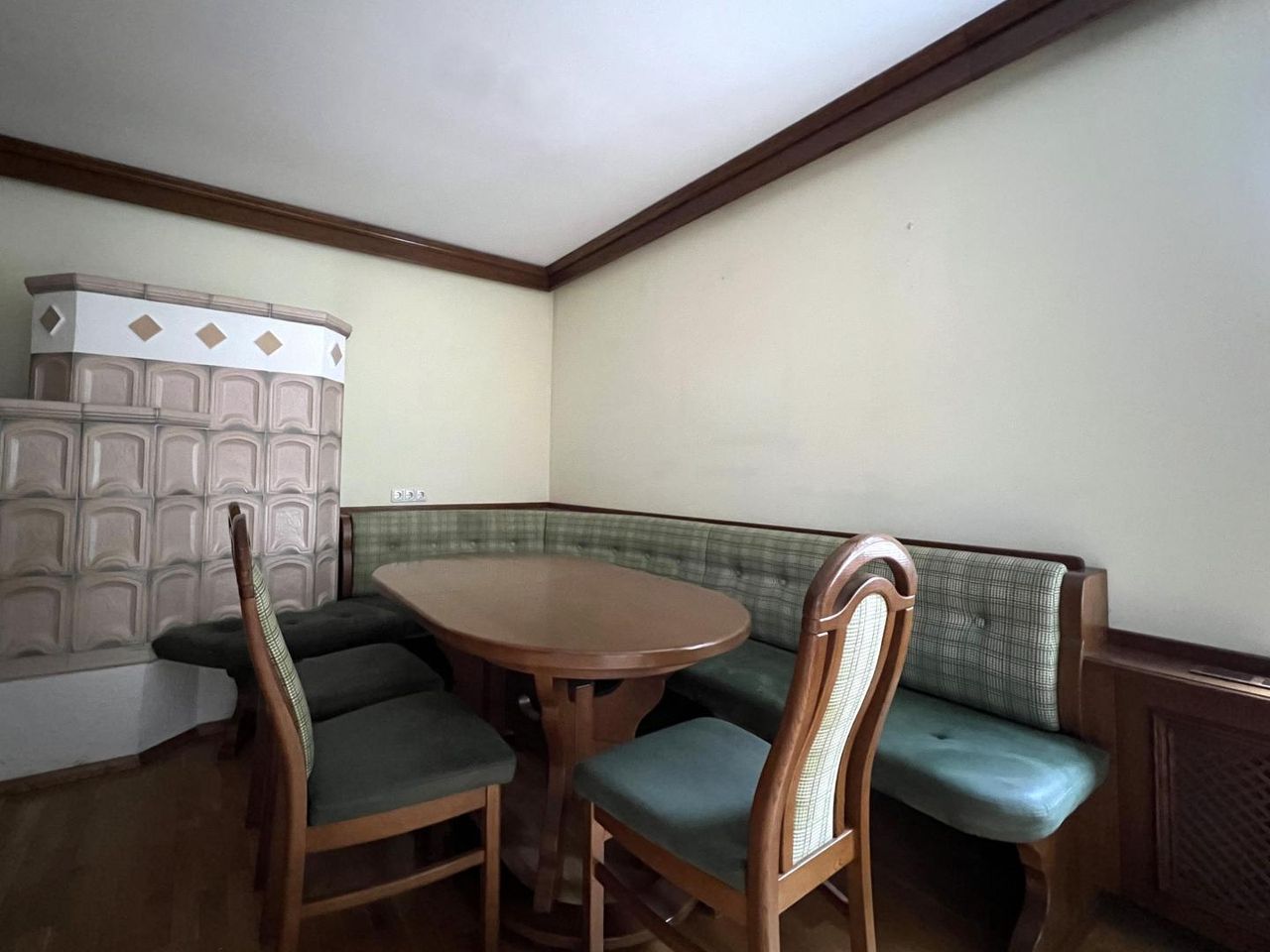 Das gemütliche Wohn-/Esszimmer ist mit einem Kachelofen ausgestattet, der behagliche Wärme verbreitet und eine gemütliche Wohnatmosphäre schafft. Die Küche ist nicht möbliert und kann nach eigenen Vorstellungen gestaltet werden.