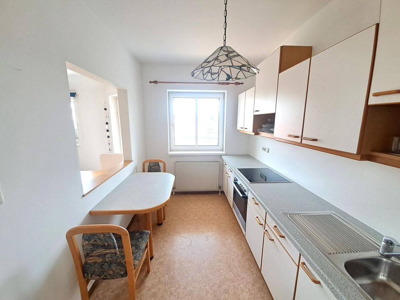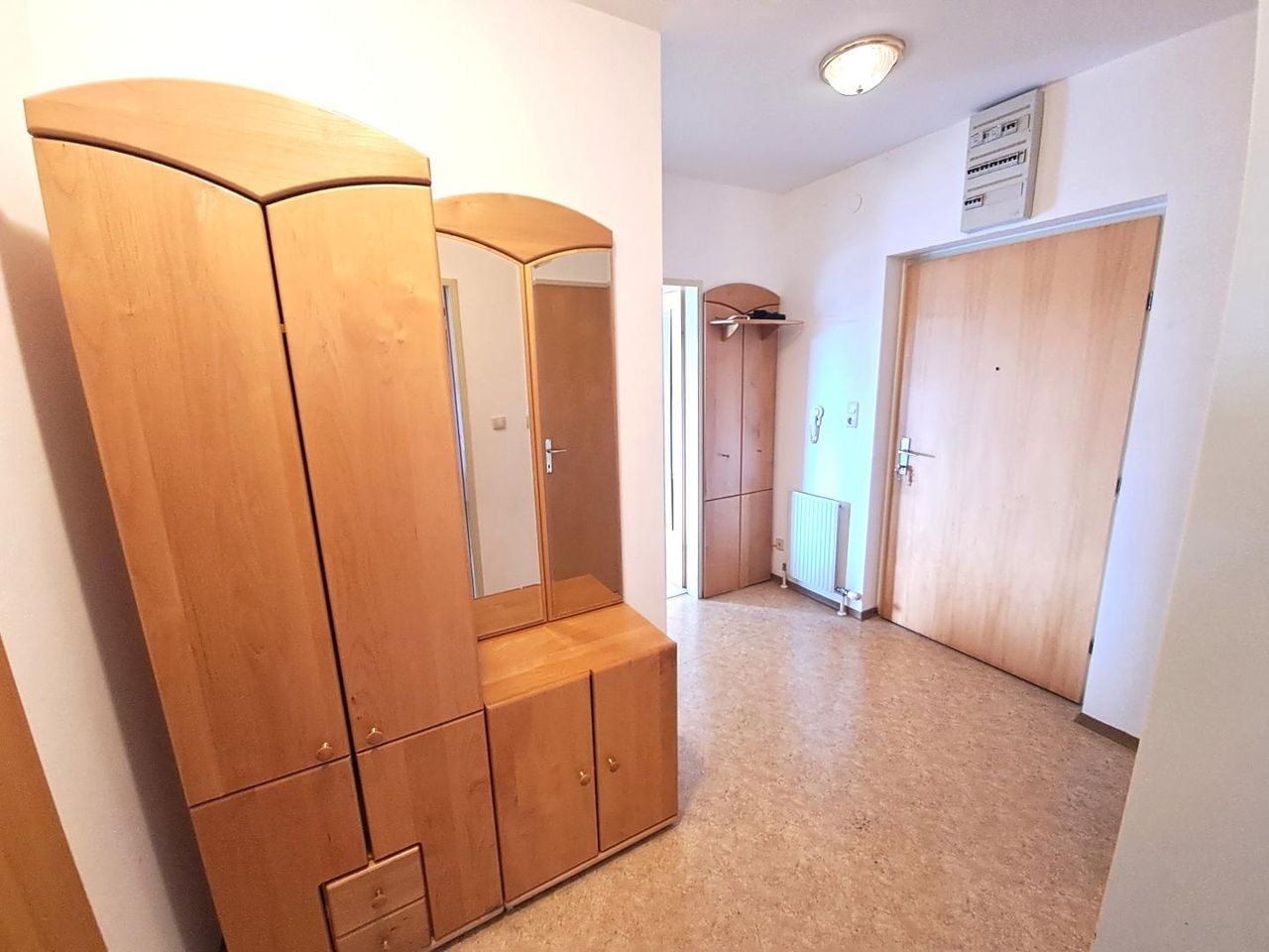 Vorraum, Abstellraum, Schlafzimmer mit Einbauschrank, Badezimmer mit Dusche u. Waschmaschinenanschluss, großes Wohnzimmer und Ausgang auf den Balkon (ostseitig), Küche mit Essbereich