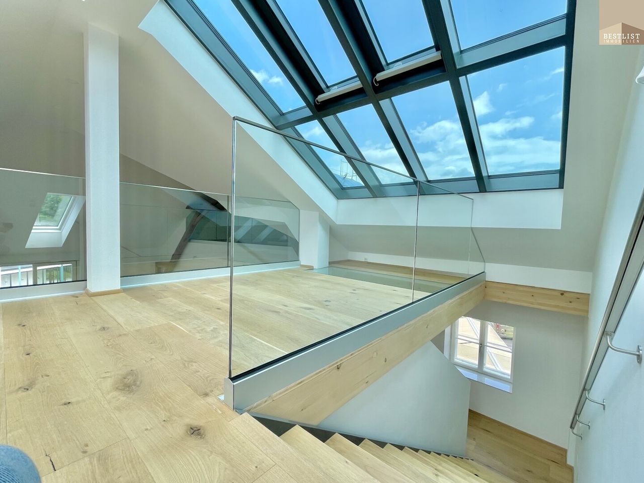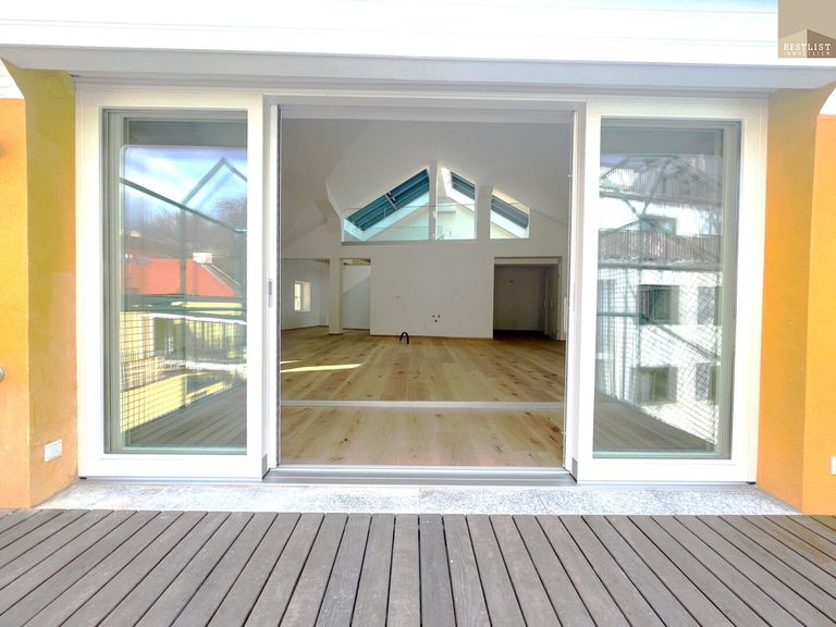Highlights sind der direkte Liftzugang in die Wohnung, ein fixer Parkplatz im Innenhof, beeindruckende Raumhöhen mit sichtbaren Holzbalken sowie ein offener Wohn-/Essbereich mit ca. 71 m². Die großzügige Terrasse lädt zum Entspannen mit Blick auf den Mühlbach ein.