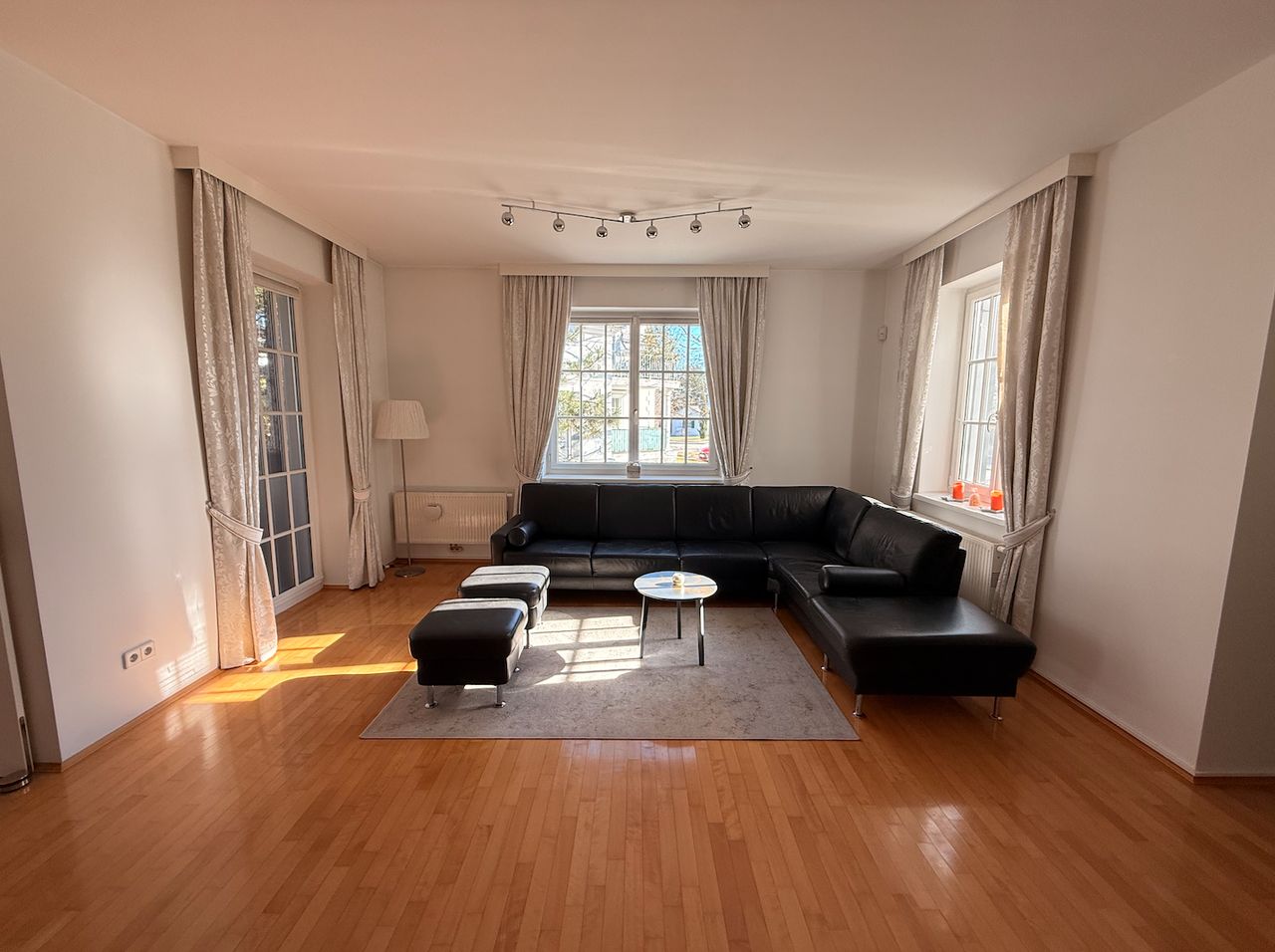 Das Herzstück der Wohnung bildet das großzügige Wohnzimmer, das durch große Fensterflächen mit Tageslicht durchflutet wird und eine angenehme, offene Atmosphäre schafft.