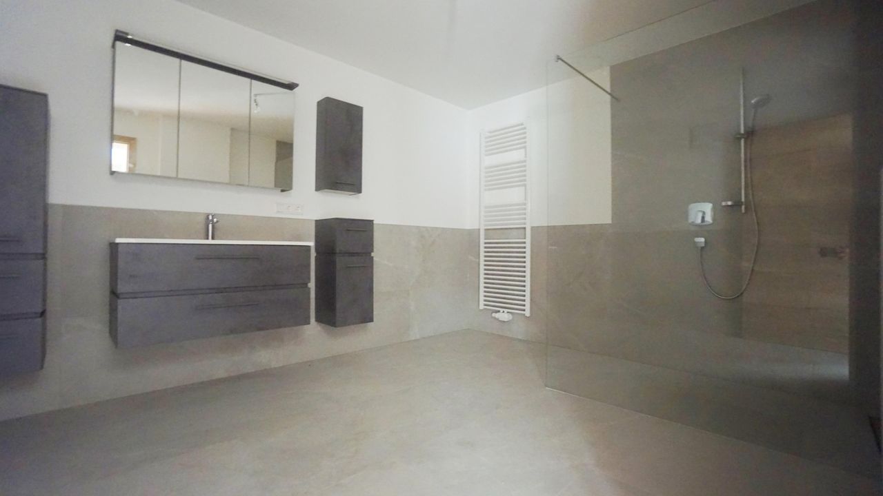 - großes Badezimmer mit Waschbecken, begehbarer Glasdusche und Waschmaschinenanschluss
