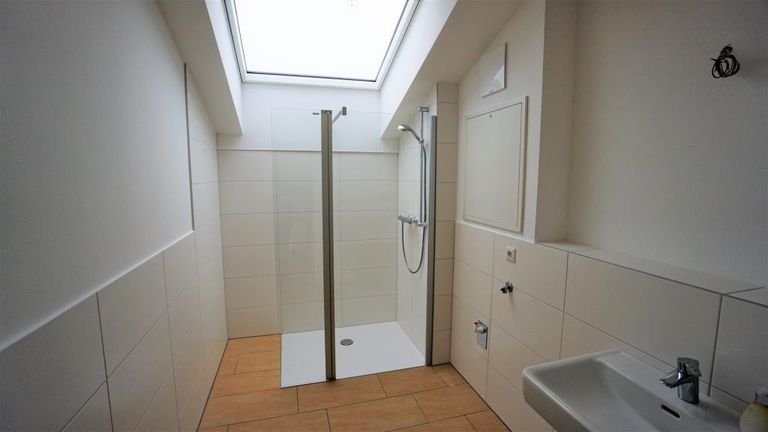 Ein tolles Bad mit Dusche, Waschbecken, Waschmaschinenanschluss und Fenster.