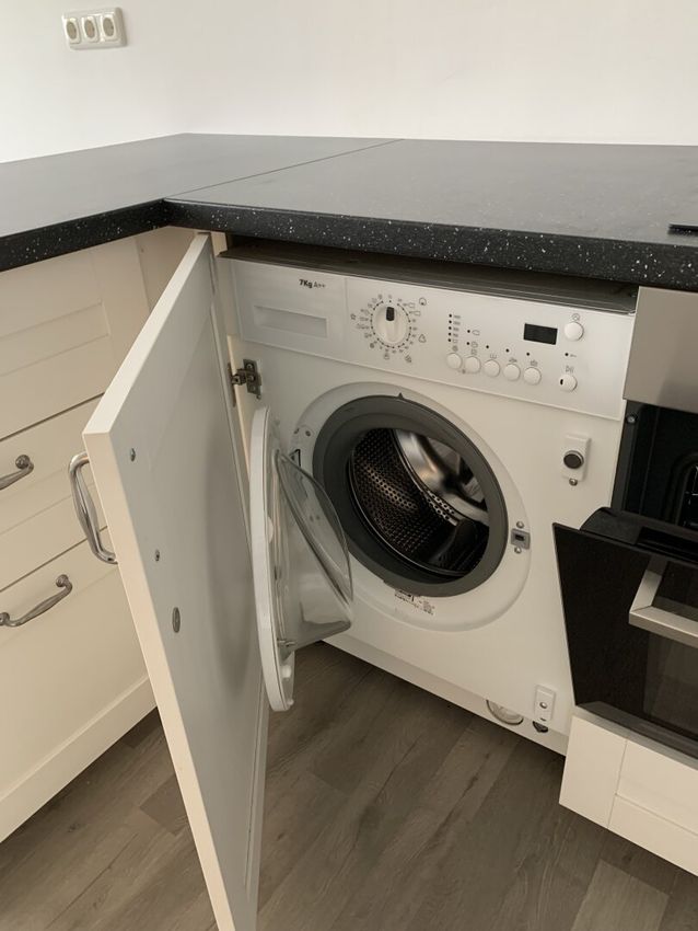 - Küche mit Elektrogeräten: Geschirrspüler, Backofen/Herd mit Ceranfeld, Kühlschrank und integrierte Waschmaschine