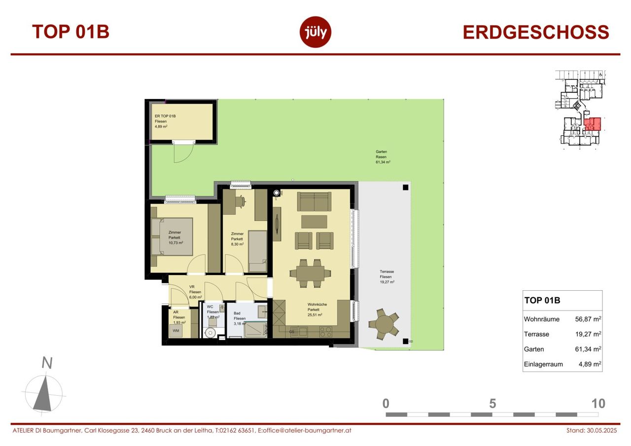 Diese 3-Zimmer Mietwohnung überzeugt mit einer durchdachten Raumaufteilung für eine kleine Familie oder Paare die einen eigenen Raum für Home-Office nützen möchten. Die Wohnfläche wird ergänzt durch den eigenen Garten mit 61m² sowie eine großzügige Terrasse mit 19 m², die in den warmen Monaten zum erweiterten Wohnzimmer wird.