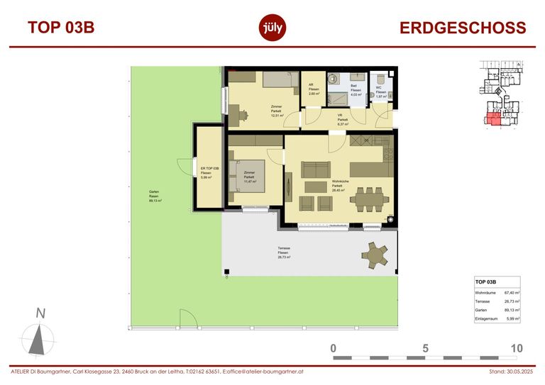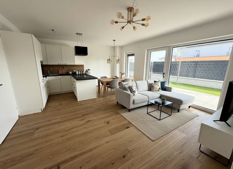 Alle Wohnungen bieten neben dem offenen Wohn-Esszimmer mit intergirierter Küche 2-3 Schlafzimmer und großzügige Terrassen mit 16 - 58 m². Die Erdgeschosswohnungen verfügen zusätzlich über eigene Gärten. So entsteht viel Raum für Ruhe, Erholung und Lebensqualität – drinnen wie draußen. Alle Wohnungen und Nebenräume sind stufenlos im Erdgeschoss bzw. mit dem Lift erreichbar. In der Gesamtmiete inkludiert sind bei jeder Wohnung 2 Parkplätze.