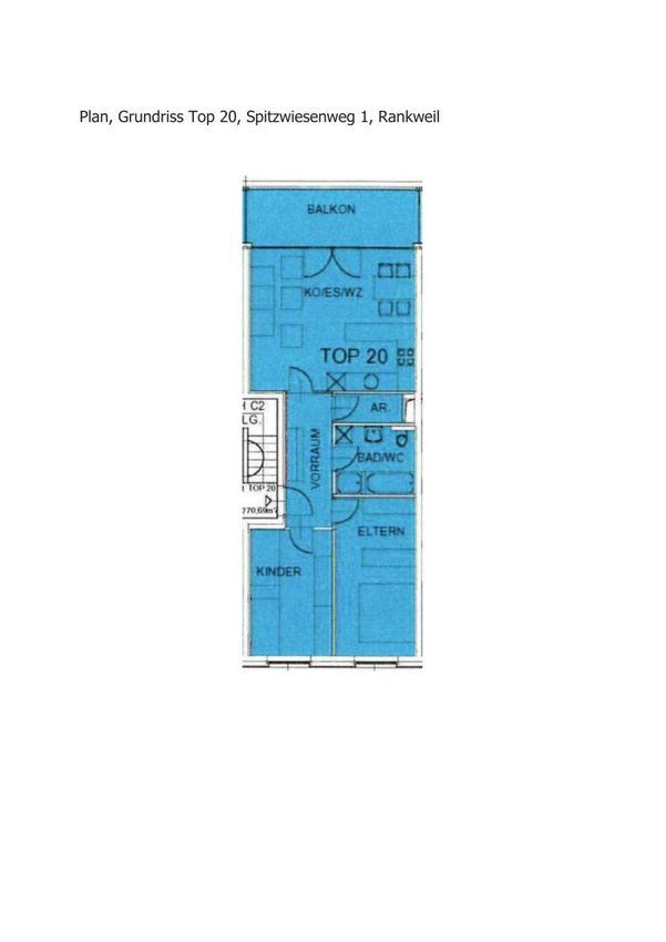 • Vorraum • Küche-Ess-Wohnzimmer • Balkon • zwei Zimmer • Badezimmer mit Badewanne & WC • Abstellraum • Kellerabteil • Carport