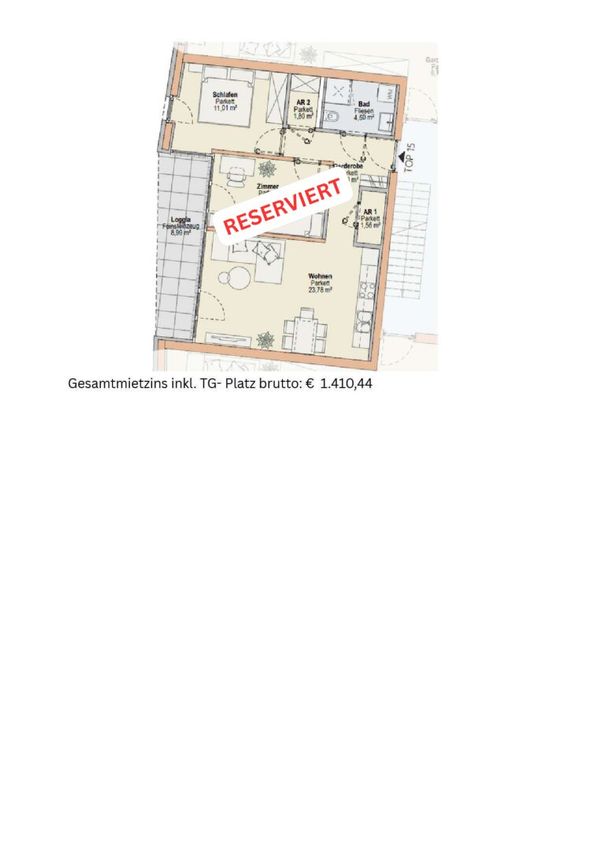 2-Zimmer-Gartenwohnung mit 46,23 m², Terrasse, Kellerabteil und Tiefgaragenplatz - Gesamtmietzins: € 1.068,29 - RESERVIERT