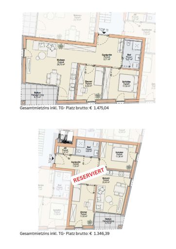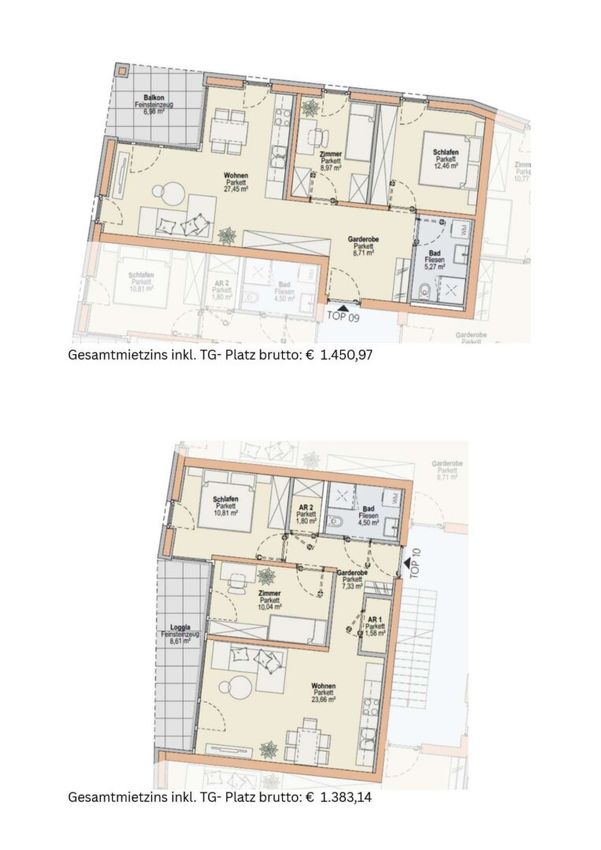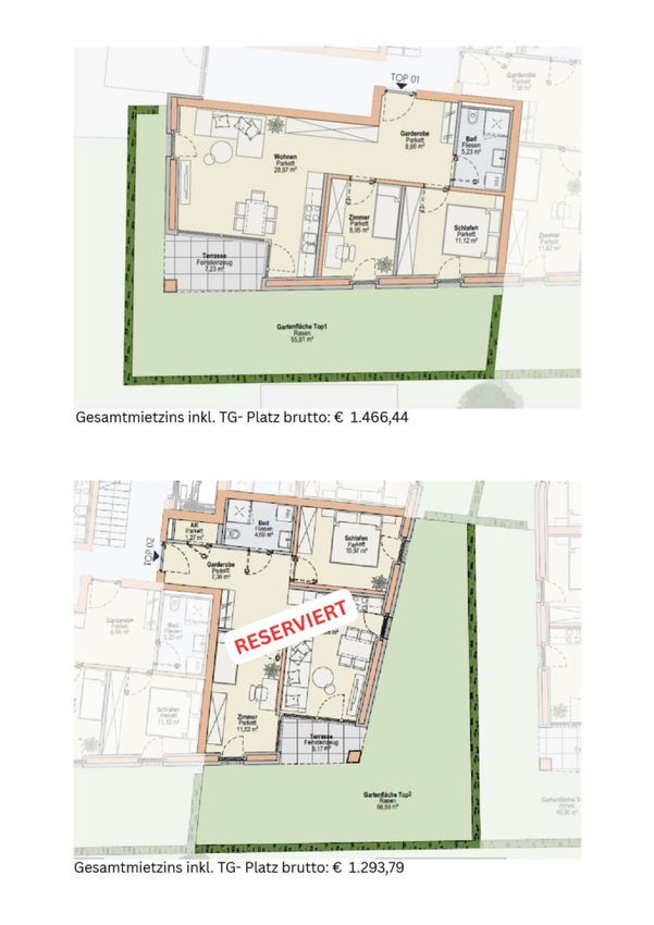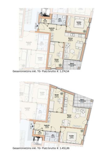Der monatliche Gesamtmietzins beinhaltet die Miete für die jeweilige Wohnung und den zugehörigen Tiefgaragen- oder Außenabstellplatz sowie Betriebs- und Heizkosten.