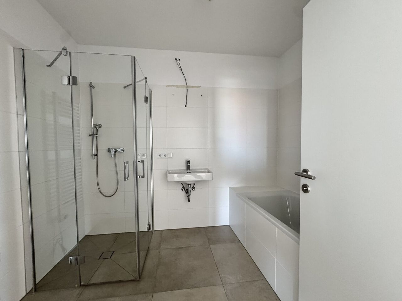Das Badezimmer präsentiert sich modern und stilvoll zugleich. Großformatige Feinsteinzeugfliesen, eine Badewanne, eine bodengleiche Dusche mit Edelstahlablaufrinne sowie hochwertige Markenarmaturen schaffen ein komfortables Wohlfühlambiente. Ein elektrischer Handtuchheizkörper ergänzt die Ausstattung funktional und elegant.