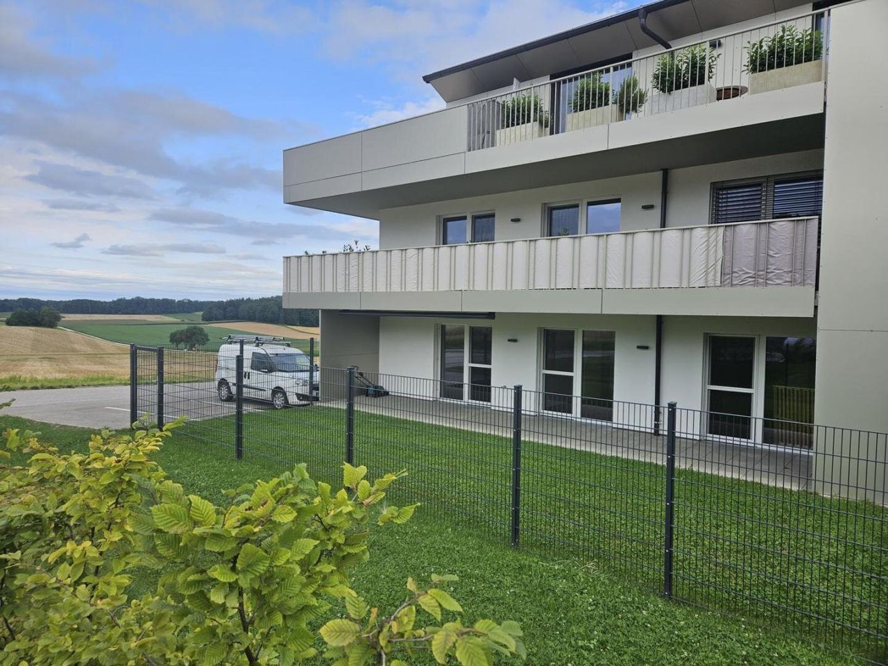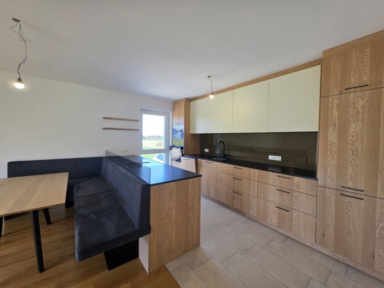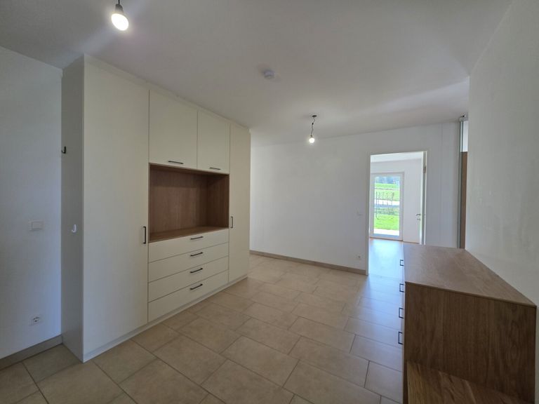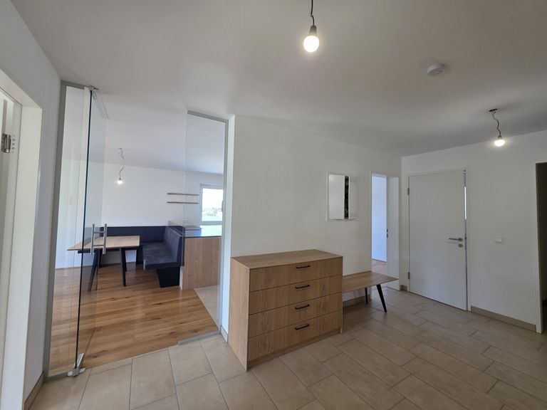 Ein großzügiger, möblierter Vorraum bietet reichlich Platz für Garderobe und Aufbewahrung. Moderne Annehmlichkeiten wie Fußbodenheizung, elektrische Raffstores und Fliegengitter erhöhen den Wohnkomfort zusätzlich. Zwei PKW-Stellplätze direkt vor der Haustür sorgen für bequeme Parkmöglichkeiten. Der schöne Fernblick auf die umliegende Bergwelt und ins Grüne schafft eine entspannende Atmosphäre.