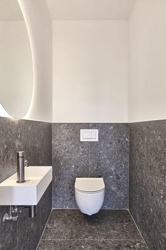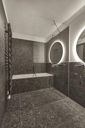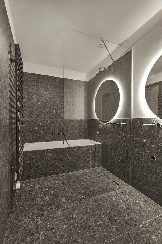 Das gesamte Badezimmer, sowie die Gäste Toilette sind Teil unserer "Gun metal black" Reihe und sind mit nobelster Ausstattung des zertifizierten italienischen Herstellers "Vallone" ausgestattet, der sich durch seine präzise Handarbeit und sein elegantes Design hervorhebt.