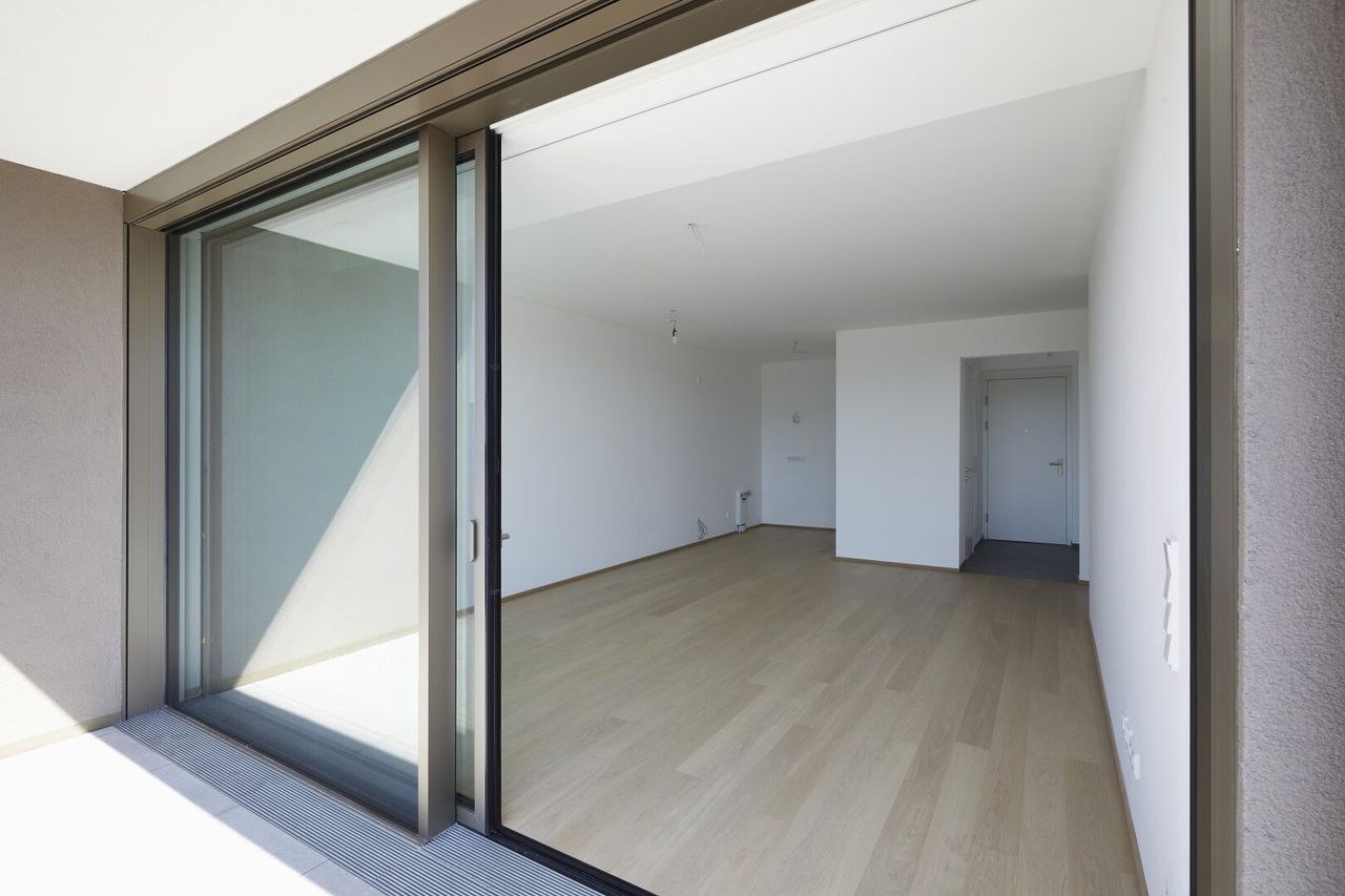 Die raumhohen Fenster des Designers Josko mit Dreifachverglasung sorgen für optimale Wärmedämmung. Die Bedienung der Schiebeelemente ist durch das minimale Gewicht der Fenster spielhaft leicht möglich. Die verbauten “Josko ONE” und “Josko ONE S” Rahmen sind zudem nur 3 Finger breit und verkörpern somit den auch sonst in der Wohnung vorhandenen puren Luxus.
