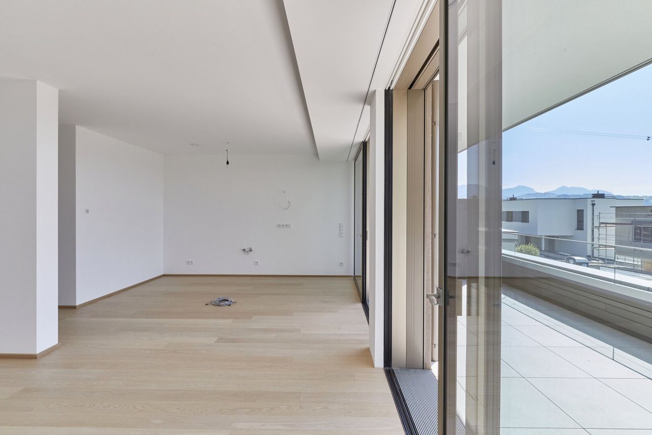 Die raumhohen Fenster des Designers Josko mit Dreifachverglasung sorgen für optimale Wärmedämmung. Die Bedienung der Schiebeelemente ist durch das minimale Gewicht der Fenster spielhaft leicht möglich. Die verbauten “Josko ONE” und “Josko ONE S” Rahmen sind zudem nur 3 Finger breit und verkörpern somit den auch sonst in der Wohnung vorhandenen puren Luxus.
