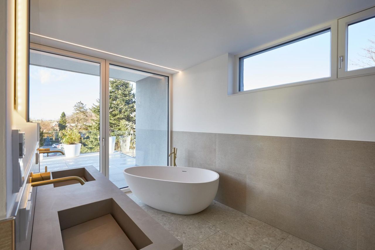 Das ca. 159 m² große 4-Zimmer-Penthouse ist etwas ganz besonderes! Sowohl bei der Raumaufteilung, der Aussicht und auch der Ausstattung. Das Penthouse ist so aufgeteilt, dass man dieses wie 2 getrennte Wohneinheiten nutzen kann. Daher stehen auch 2 luxuriöse Bäder zur Verfügung. Das "Elternbad" en Suite ist mit einer begehbaren Dusche, einer Badewanne, einem Doppelwaschbecken und exklusiv Materialien ausgestattet. Das absolute Highlight der Immobilie ist das mit Fischgrätparkett ausgestattete ca. 61 m² große Wohnzimmer mit Wohnküche. Das Wohnzimmer mit Seeblick, das Elternschlafzimmer und das Elternbad haben Aussichtslage und Zugang zur herrlichen ca. 83 m² großen Terrasse mit Sonnensegel.