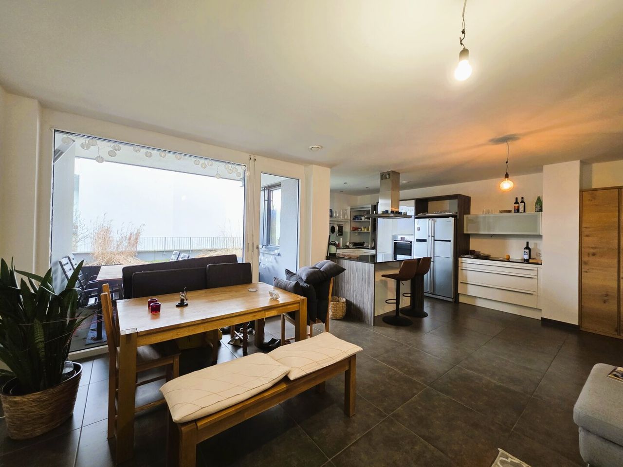 Herzstück der Wohnung ist der beeindruckend große Wohn-, Koch- und Essbereich mit rund 44 m². Die hochwertige Küche überzeugt mit durchdachter Ausstattung, viel Arbeitsfläche und bietet beste Voraussetzungen für angenehmes Kochen mit Blick in die umliegende Berglandschaft.