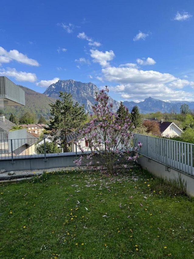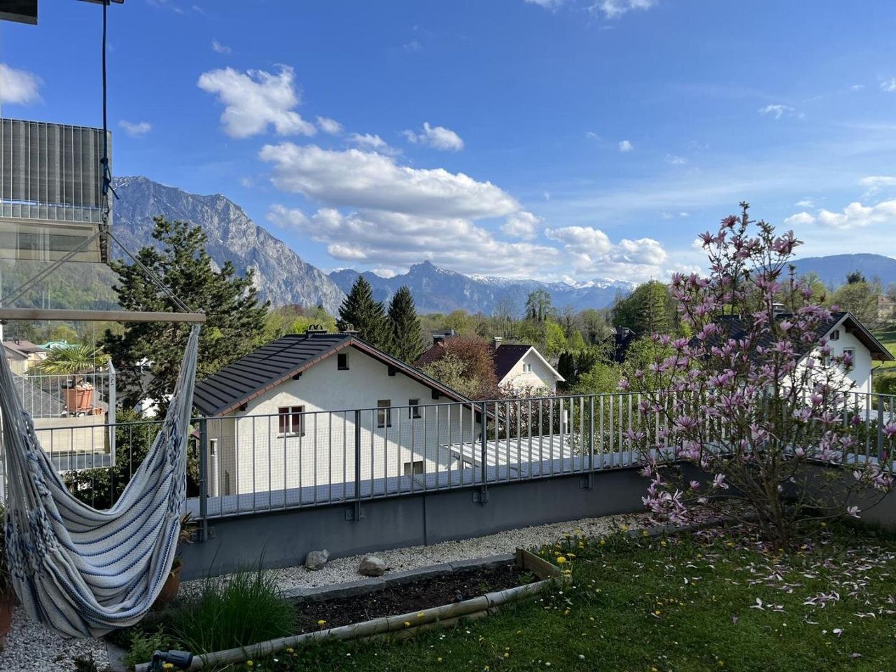 Sowohl vom Wohnzimmer als auch vom Elternschlafzimmer aus gelangt man auf die Terrasse und in den eigenen Garten. Von hier genießt man einen wunderbaren Ausblick auf den Traunstein und die umliegende Bergwelt.