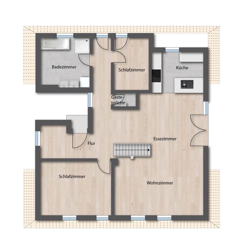 • Beheizung über eine effiziente Gaszentralheizung, die auch das Warmwasser aufbereitet
