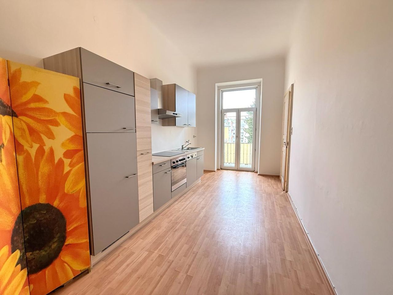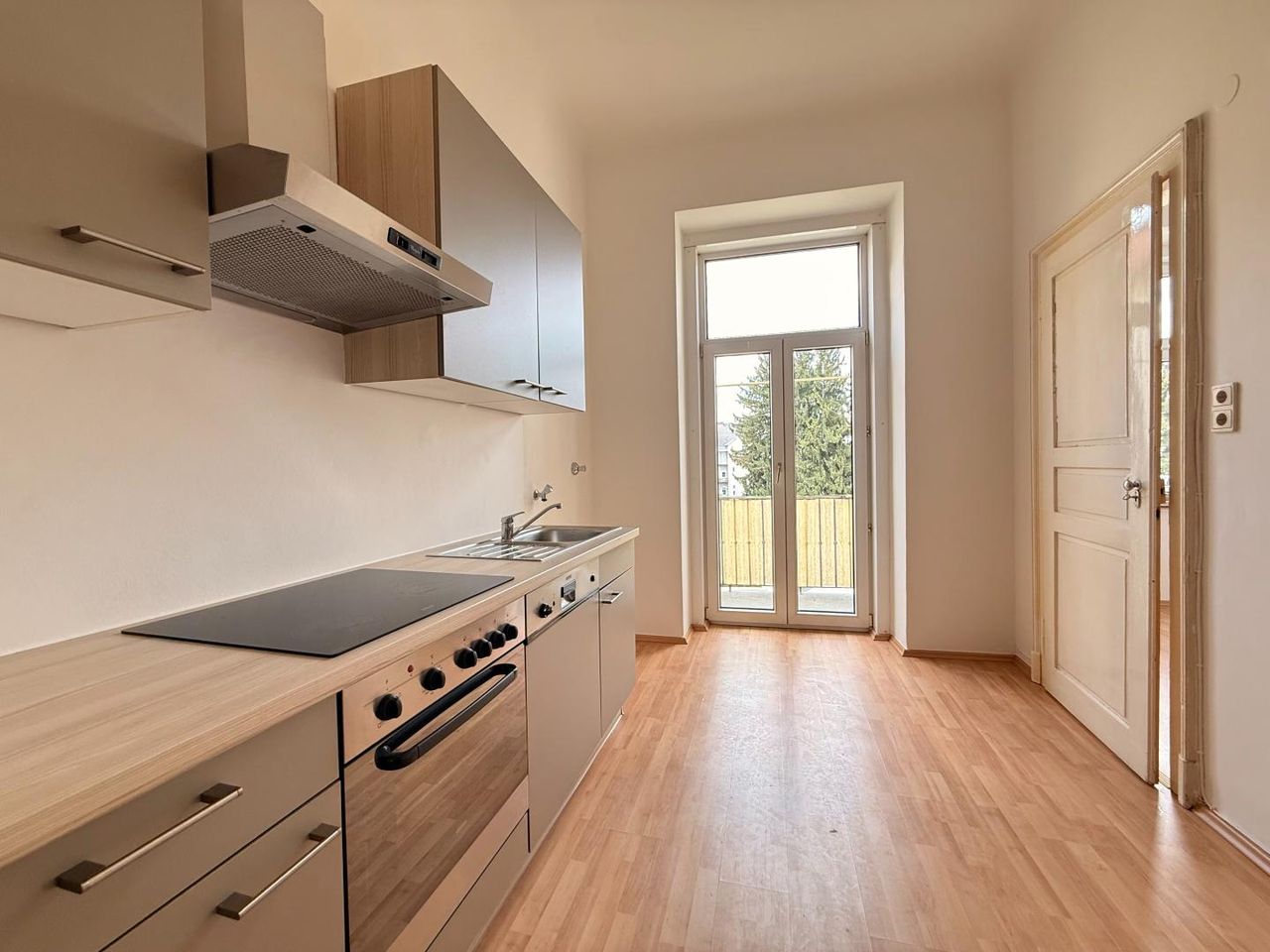 Herzstück der Wohnung sind zwei wunderschöne, helle Zimmer mit stilvollen Flügeltüren, die den besonderen Charakter dieser Immobilie unterstreichen. Die separate Küche ist mit einer neuen Küchenzeile ausgestattet und bietet zusätzlich Zugang zu einem kleinen, vielseitig nutzbaren Nebenraum – ideal als Speisekammer, Arbeitszimmer oder Abstellraum.