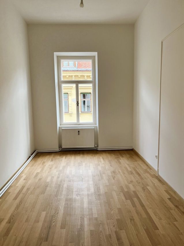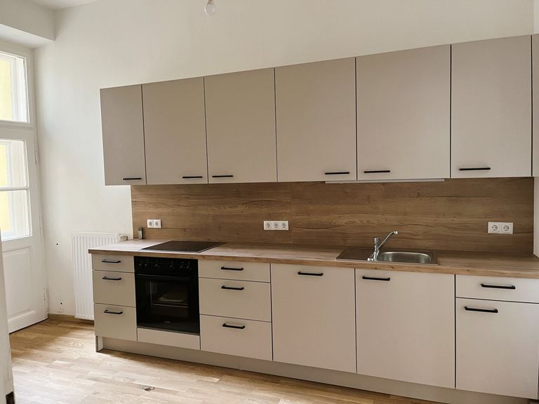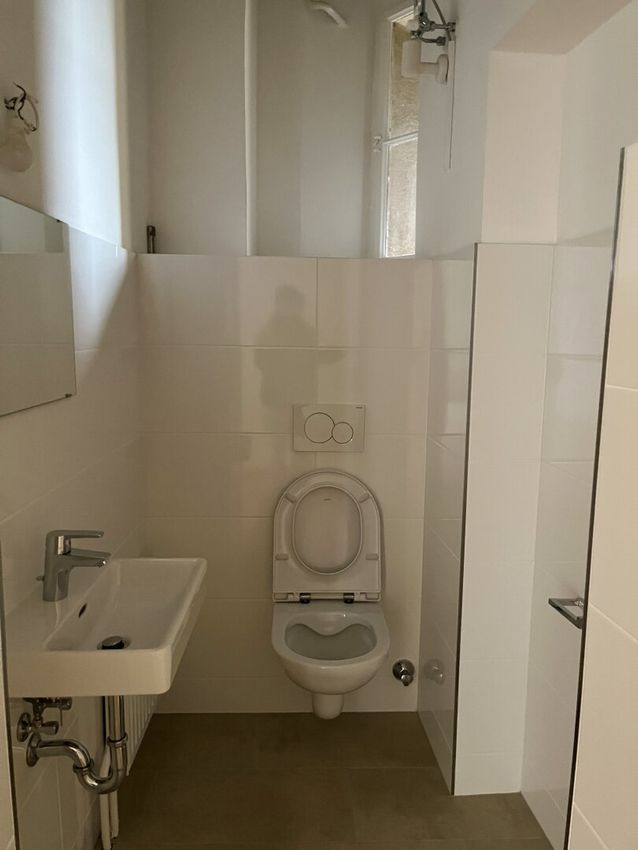 Die möblierte Küche ist funktional ausgestattet und bietet ausreichend Platz. Das modern gestaltete Badezimmer verfügt über eine Dusche, zusätzlich gibt es ein separates WC. Hochwertige Parkettböden in den Wohnräumen sowie stilvolle Fliesen in Bad, WC und Nebenräumen unterstreichen die Qualität der umfassenden Sanierung.