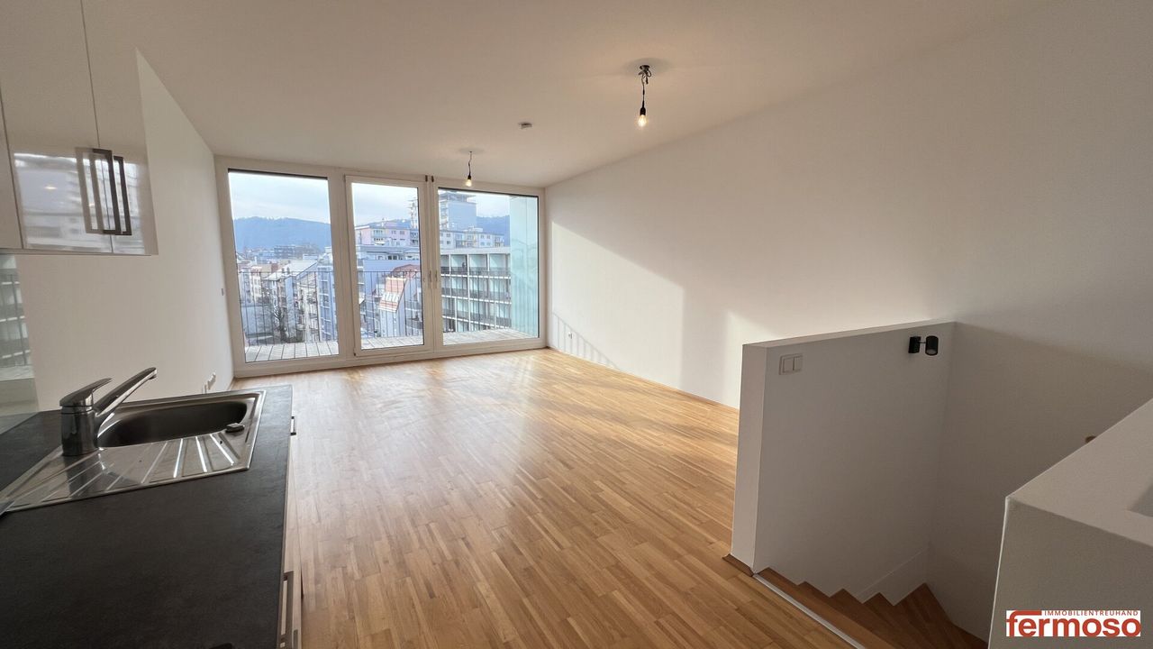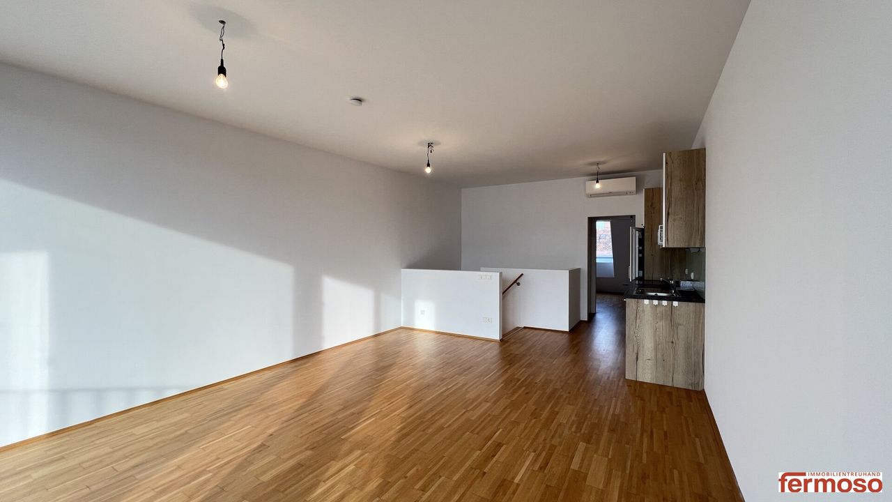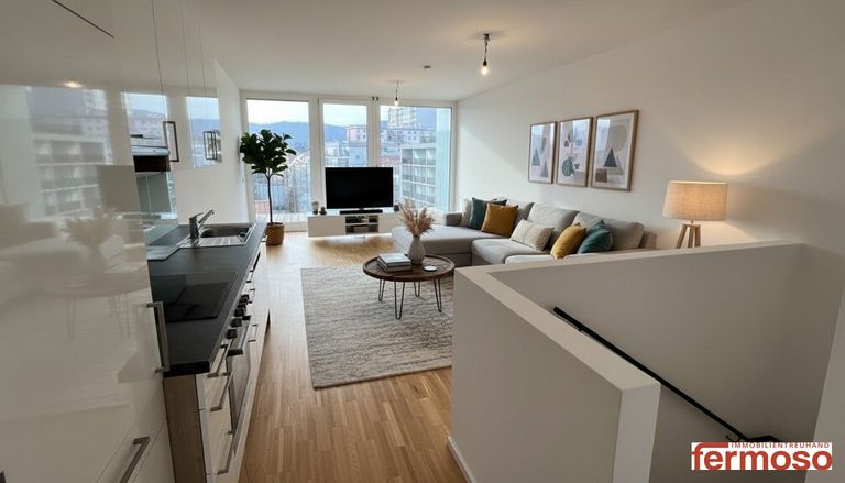 diese besondere 3-Zimmer-Maisonettewohnung überzeugt durch eine moderne Raumaufteilung auf zwei Ebenen, großzügige Wohnbereiche und eine attraktive Loggia, die zusätzlichen Freiraum im Freien bietet. Die Wohnung verbindet stilvolles Wohnen mit einer offenen und zugleich funktionalen Gestaltung – ideal für Paare, Familien oder Menschen mit Homeoffice-Bedarf.