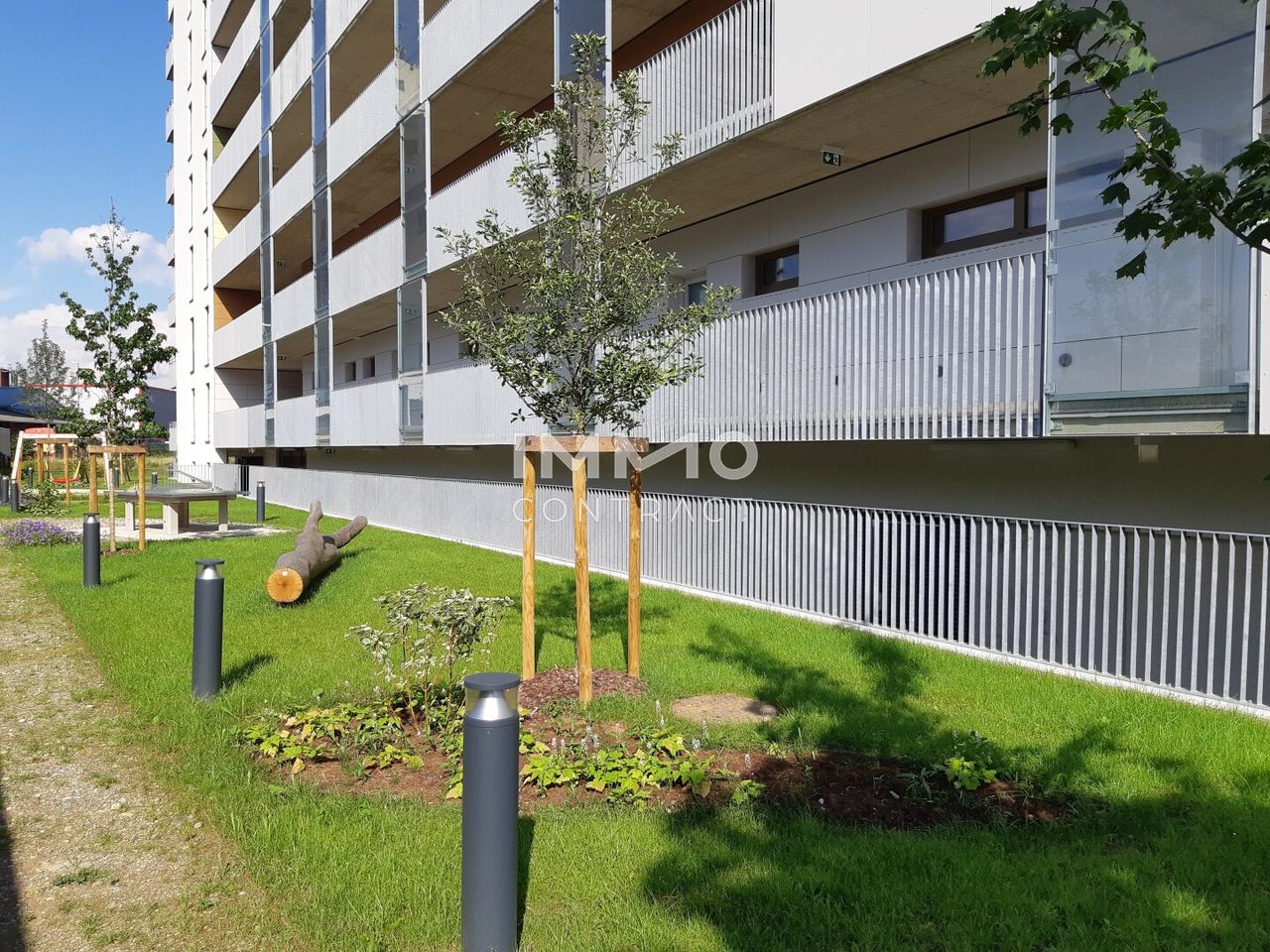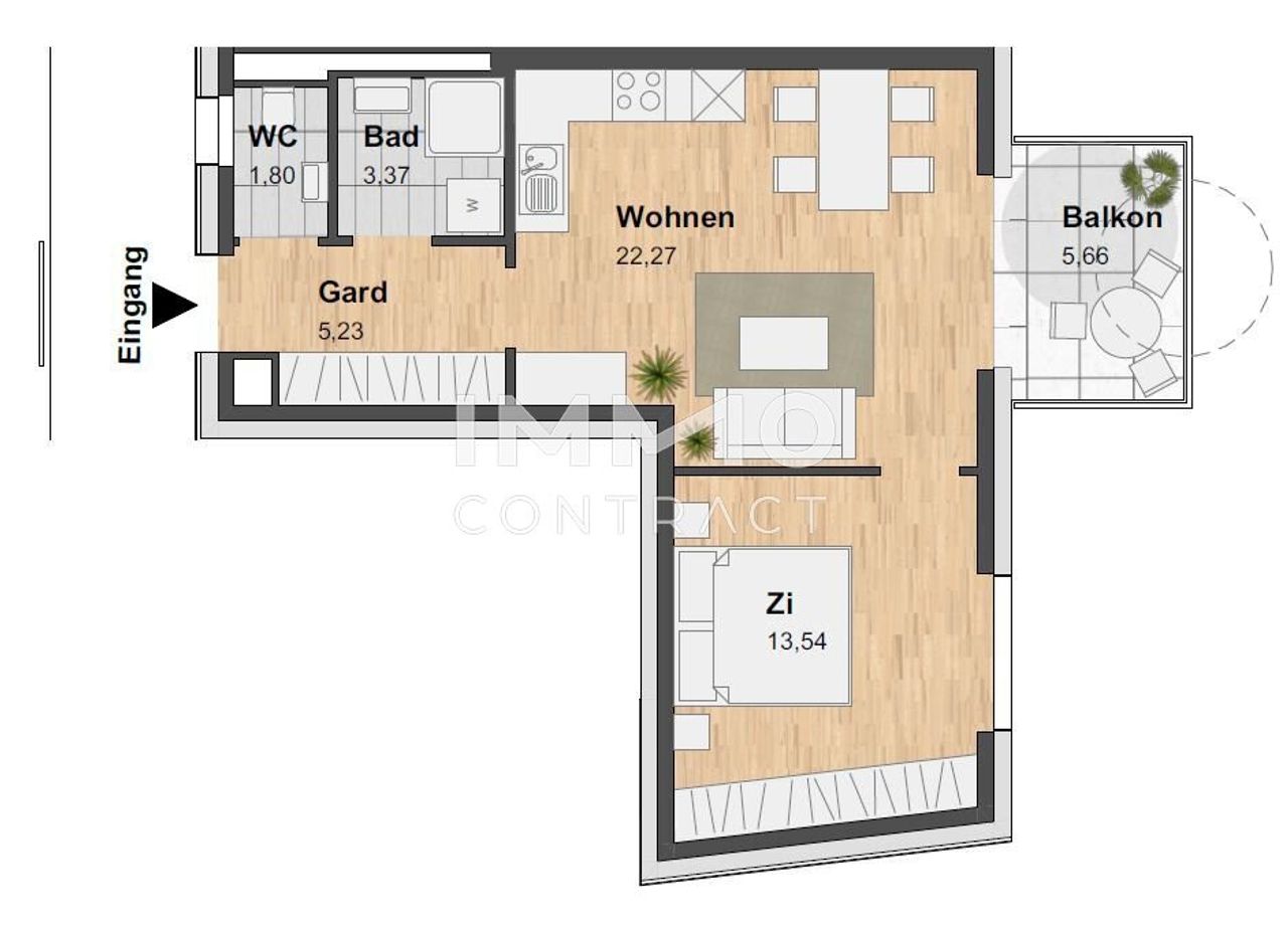Vom Wohnungseingang gelangt man in die Garderobe mit direktem Zugang zum Badezimmer, zum WC mit Fenster und zum Wohnbereich. Dieser ist mit einer Einbauküche sowie Platz für Essen und Wohnen ausgestattet. Vom Wohnzimmer gelangt man ins Schlafzimmer. Der Wohnbereich verfügt über Fenstertüren zum Balkon.