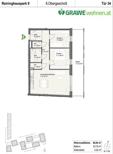 68,38 m² m² Wohnung im Reininghauspark 9 im 6. Stock mit Lift und BALKON bestehend aus,