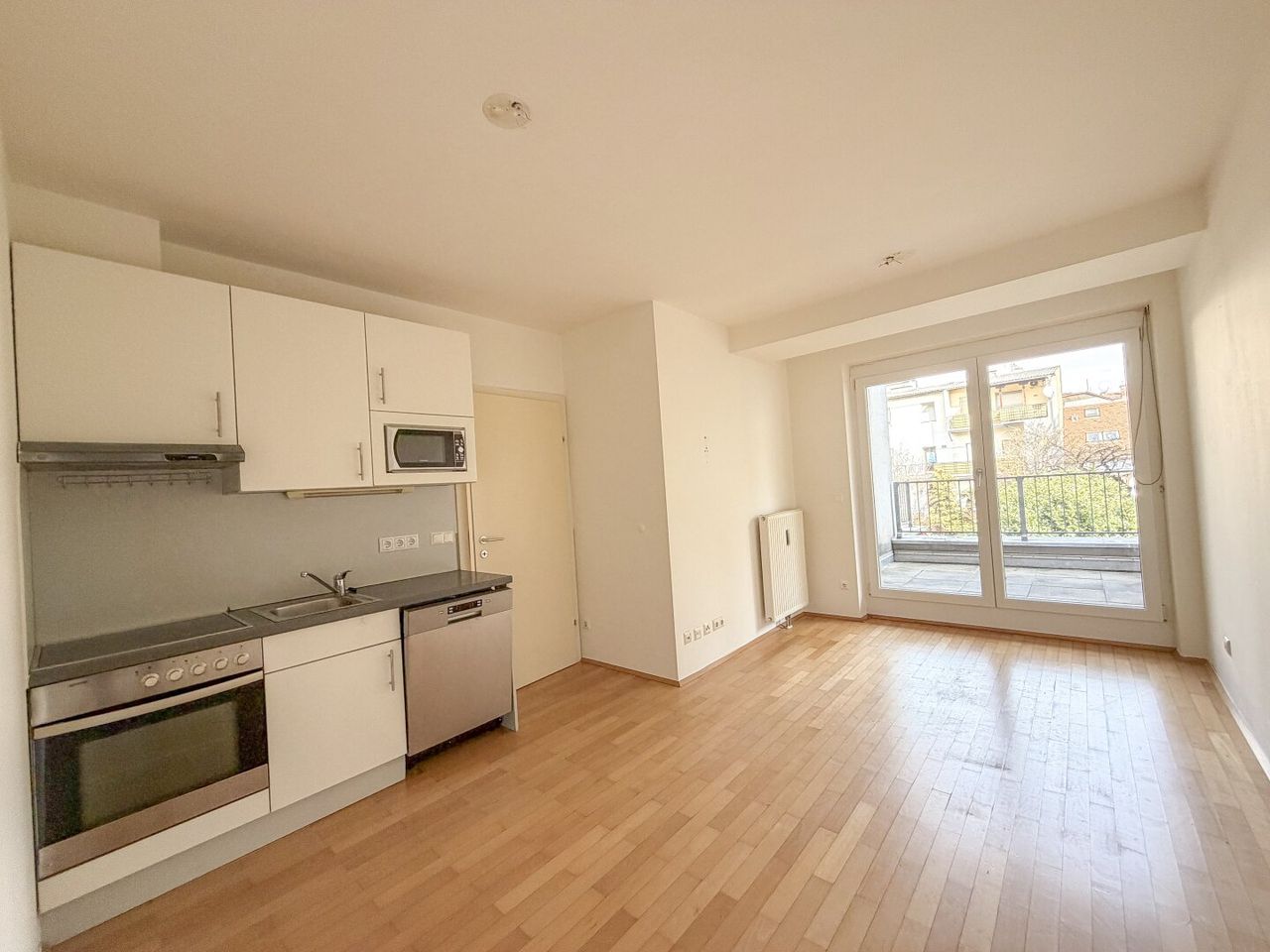 Wohnzimmer mit möblierter Küche und Zugang zum 1. Balkon