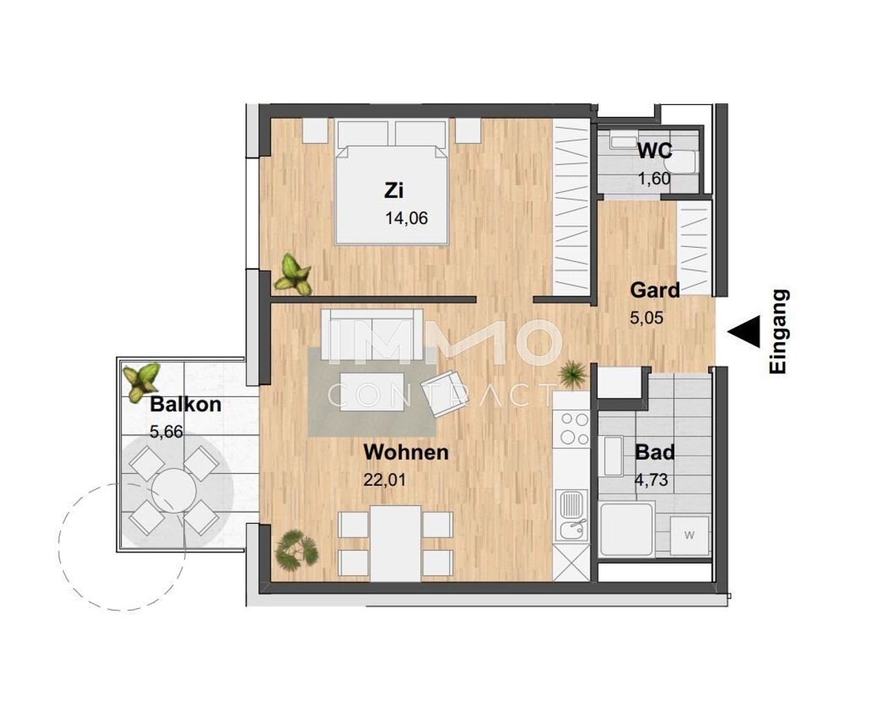 Vom Wohnungseingang gelangt man in die Garderobe mit direktem Zugang zum Badezimmer, zum WC und zum Wohnbereich. Dieser ist mit einer Einbauküche sowie Platz für Essen und Wohnen ausgestattet. Zudem erfolgt der Zugang zum Schlafzimmer über diese Räumlichkeit. Der Wohnbereich verfügt über Fenstertüren zum Balkon.