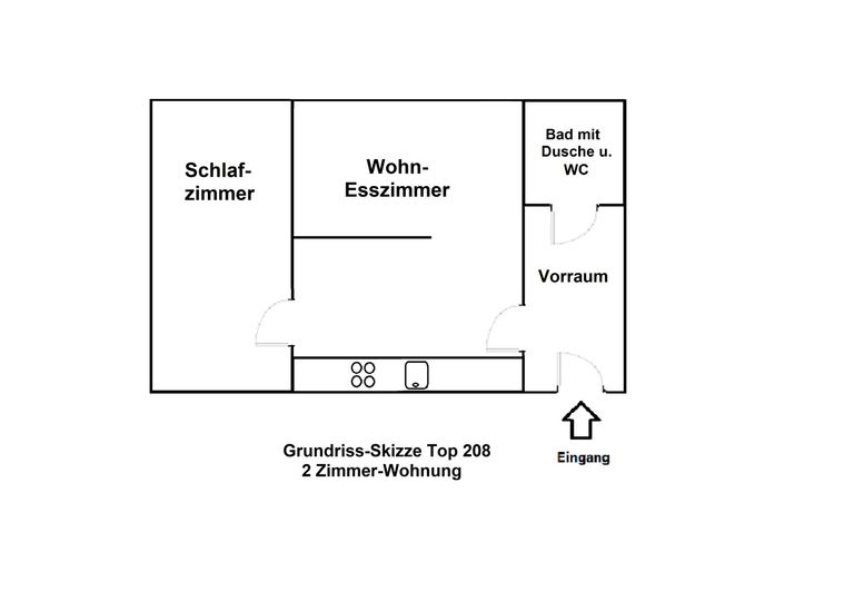 Aufgeteilt ist die Wohnung in einen Wohnraum mit Essplatz und Küche, ein Schlafzimmer, ein Bad mit Dusche und WC und einen Vorraum.