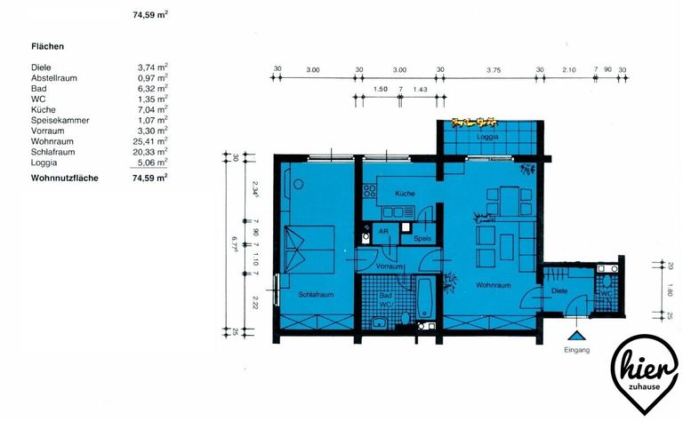 Vorraum, Wohnzimmer, Küche mit Speisekammer, Schlafzimmer, Bad mit Wanne & WC, separates WC, Abstellraum, Loggia