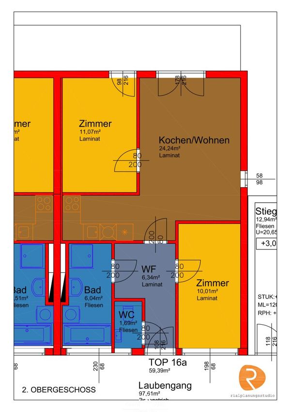 - einem Badezimmer (Dusche, Badewanne, Spiegel, Waschbecken mit Verbau, Waschmaschinenanschluss und Fenster)