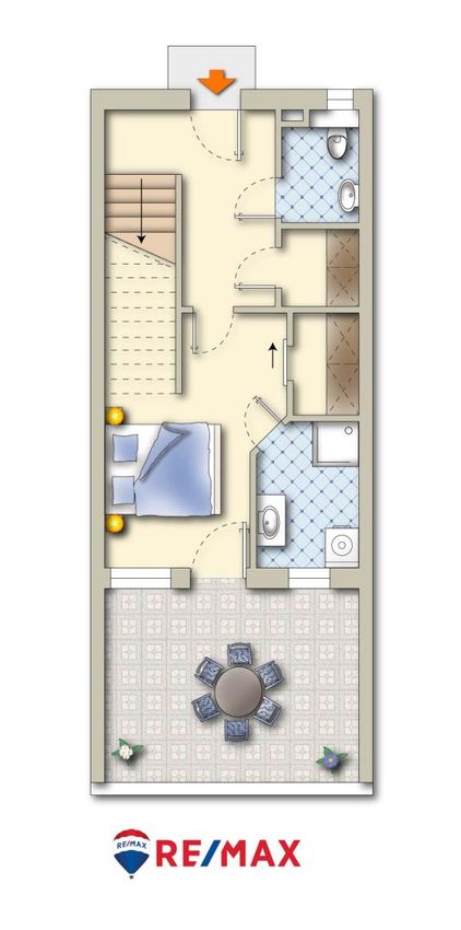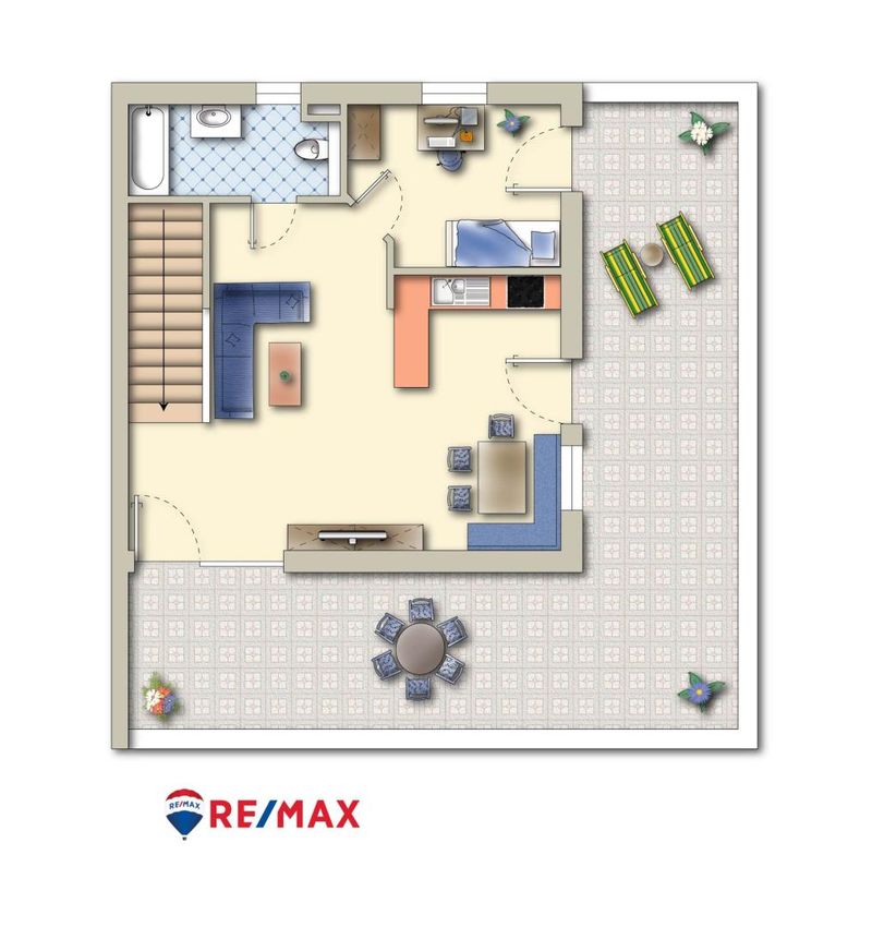 Von sämtlichen Räumen im Obergeschoss – mit Ausnahme des Badezimmers – gelangen Sie direkt auf die weitläufige Terrasse, die zum Entspannen und Genießen einlädt.