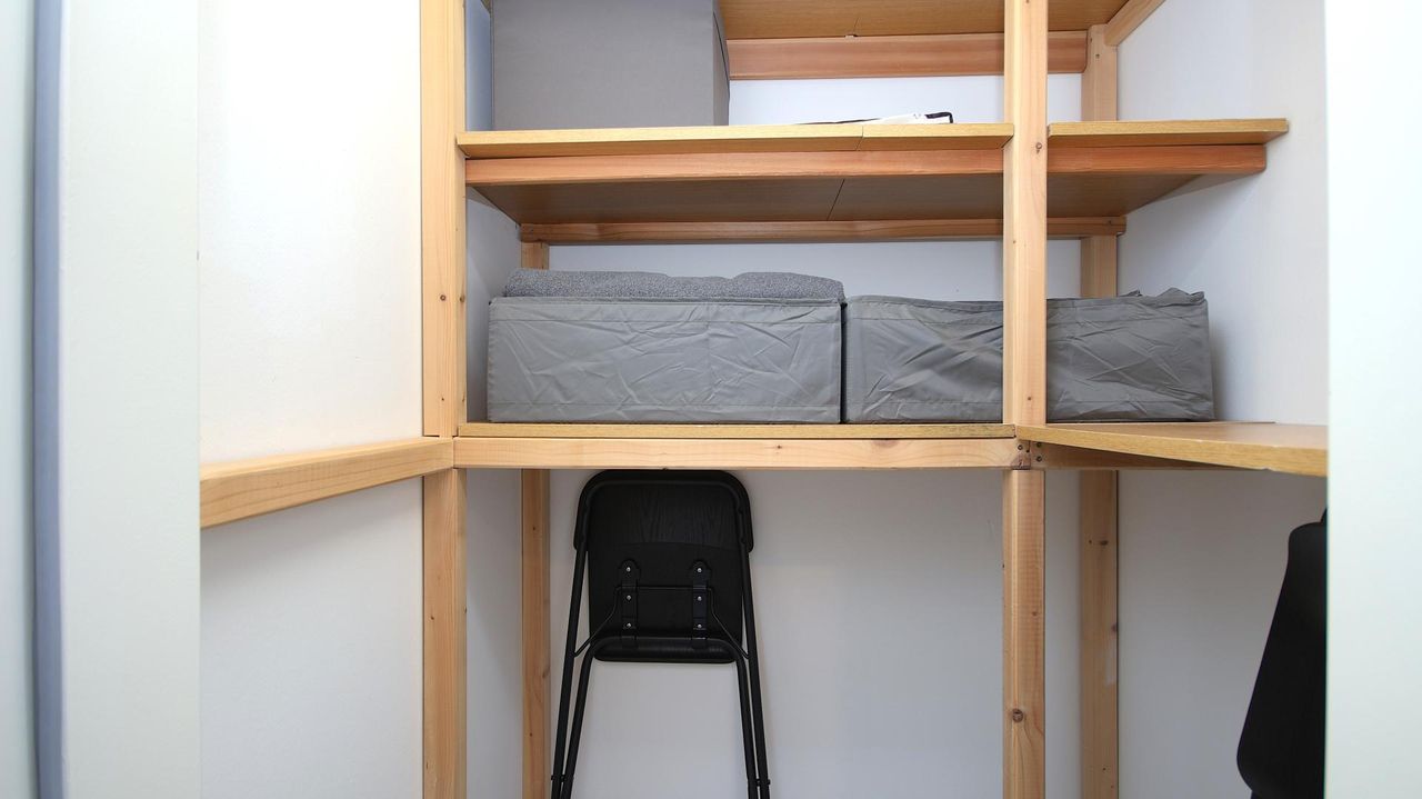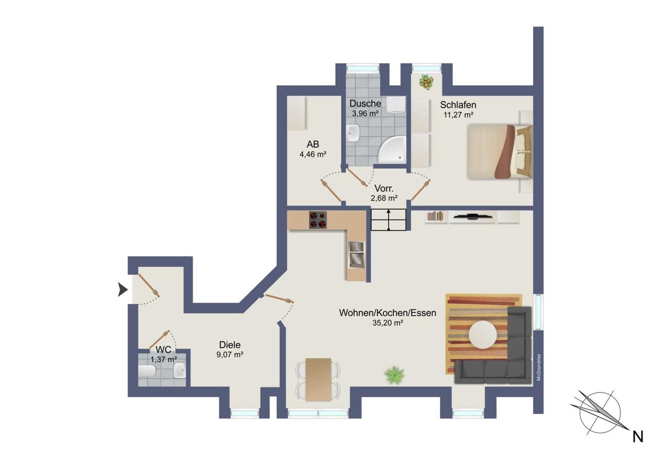 Der Grundriss gliedert sich in einen Vorraum mit Zugang zu WC und Abstellraum. Im Anschluss folgt der Essbereich mit kleinem Tisch, direkt gegenüber der hochwertig ausgestatteten Küche. Das offene Wohnzimmer mit sichtbaren Holzbalken sorgt für eine angenehme Wohnatmosphäre. Ergänzt wird das Angebot durch ein Badezimmer, ein Schlafzimmer sowie einen weiteren großzügigen Abstellraum.