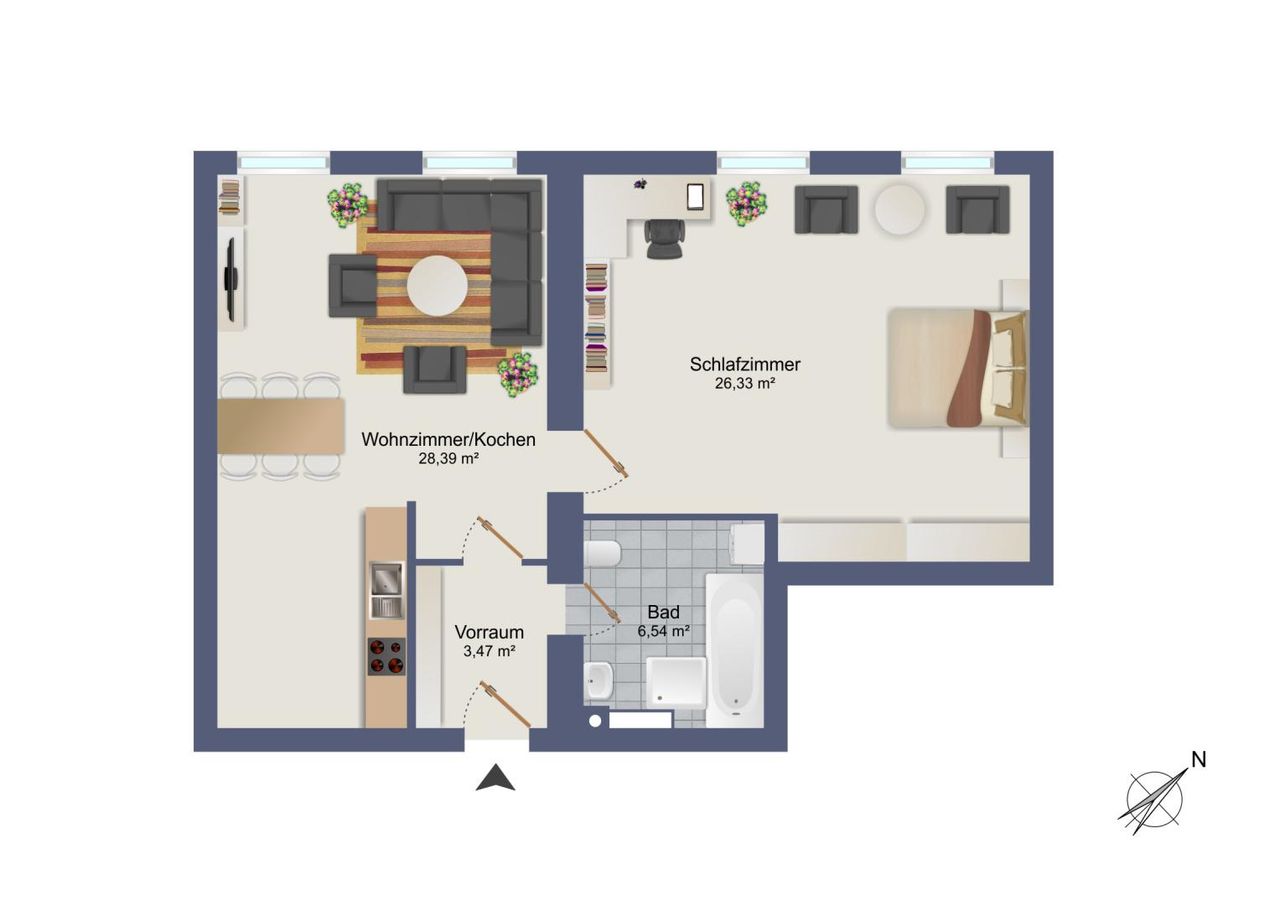 Die Wohnung besticht durch ihre durchdachte Aufteilung mit Schlafzimmer, heller Wohnküche, Bad/WC und einem Vorraum. Eine vom Vormieter neu eingebaute Küche und ein Kellerabteil ergänzen das Angebot optimal.