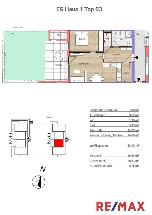 • Ca. 58 m² Wohnfläche und ca. 70 m² Gartenanteil