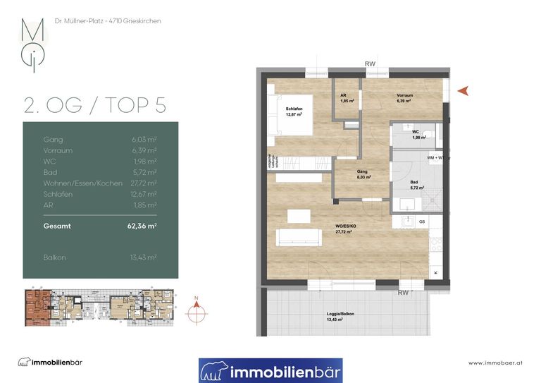 Mitten im charmanten Zentrum von Grieskirchen befindet sich ein stilvolles Wohn- und Geschäftsgebäude mit 17 Wohnungen und 3 Gewerbeflächen. Ideal für alle, die urbanes Leben, Qualität und Komfort schätzen. Die moderne Architektur verbindet hochwertige Ausstattung mit durchdachten Grundrissen und bester Infrastruktur.