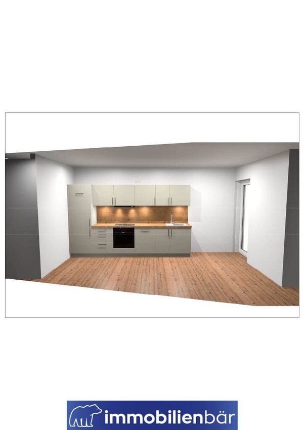 Die Wohnung wird mit einer hochwertigen Einbauküche ausgestattet: Fronten in elegantem Platingrau, schwarze Metallgriffe und eine Arbeitsplatte in Chalet Eiche sorgen für ein modernes, harmonisches Gesamtbild.