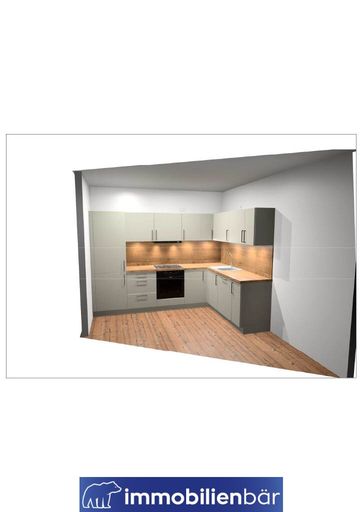 Die Wohnung wird mit einer hochwertigen Einbauküche ausgestattet: Fronten in elegantem Platingrau, schwarze Metallgriffe und eine Arbeitsplatte in Chalet Eiche sorgen für ein modernes, harmonisches Gesamtbild.