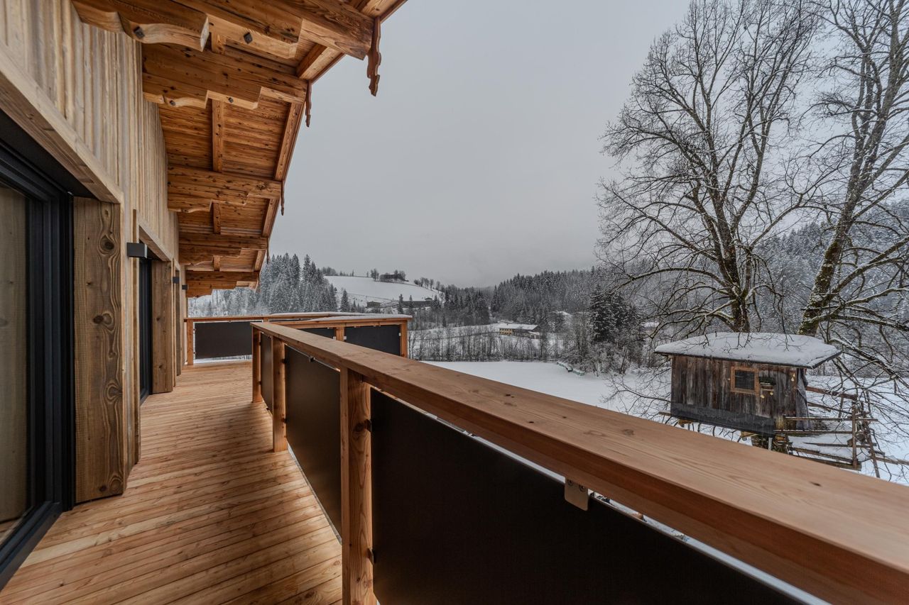 Masterzimmer mit Bad en suite und Zugang zum südseitigen Balkon bzw. Terrasse mit idyllischem Blick auf das Kitzbüheler Horn und Loferer Steinberge, 2. Schlafzimmer, ein weiteres Badezimmer (hier ist auch ein Waschmaschinen- und Trockneranschluss vorhanden) sowie ein einladendes, großzügiges, offenes Wohnen/Essen/Kochen (eine hochwertige Küche ist eingebaut) mit Zugang zum Südbalkon bzw. Panoramaterrasse sowie auch zur nordseitigen Terrasse mit wunderbarem, freien Blick auf den hoheitsvollen Wilden Kaiser