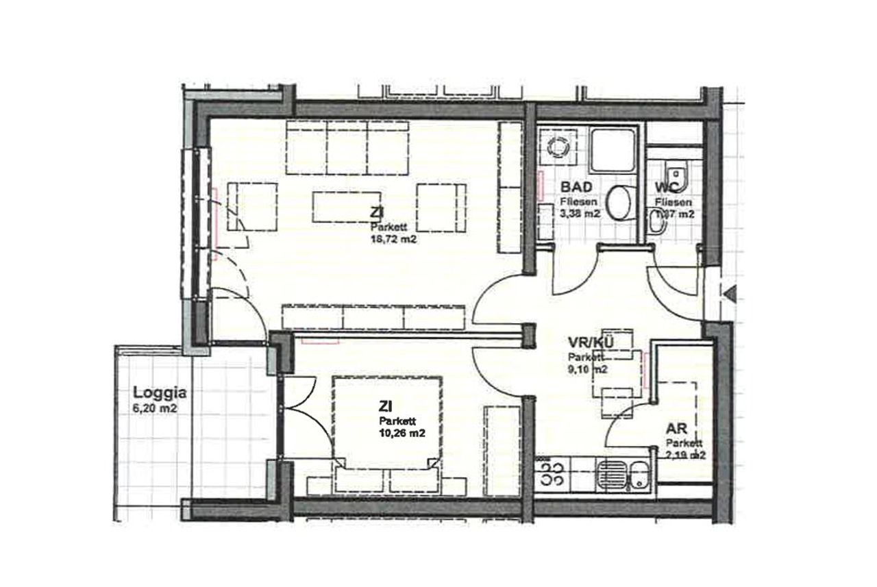 Miete inkl. Betriebskosten (Wohnung, Tiefgaragenabstellplatz, Kellerabteil): EURO 735,–