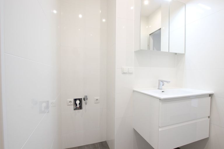 Das Badezimmer ist mit einer modernen Walk-In Dusche mit Edelstahl-Abflussrinne, Handtuchheizkörper und Waschmaschinenanschluss ausgestattet. Außerdem sorgt ein attraktiver Waschtisch und Spiegelschrank für Styling im Badezimmer. Viel Stauraum bietet ein praktischer Abstellraum.