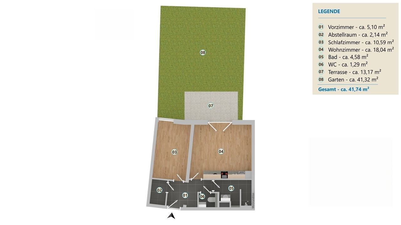Bestlage im Zentrum Korneuburgs: Diese moderne, im ruhigen Innenhof gelegene 2-Zimmer-Gartenwohnung, Baujahr 2021, bietet alle Annehmlichkeiten einer Stadtwohnung. Im Garten (ca. 54,5m²) befindet sich eine schöne, westseitig ausgerichtete Terrasse (ca. 13,2m²).