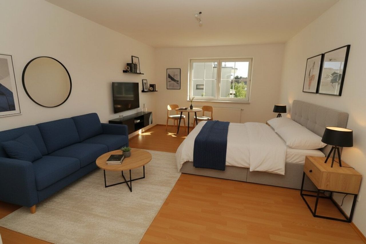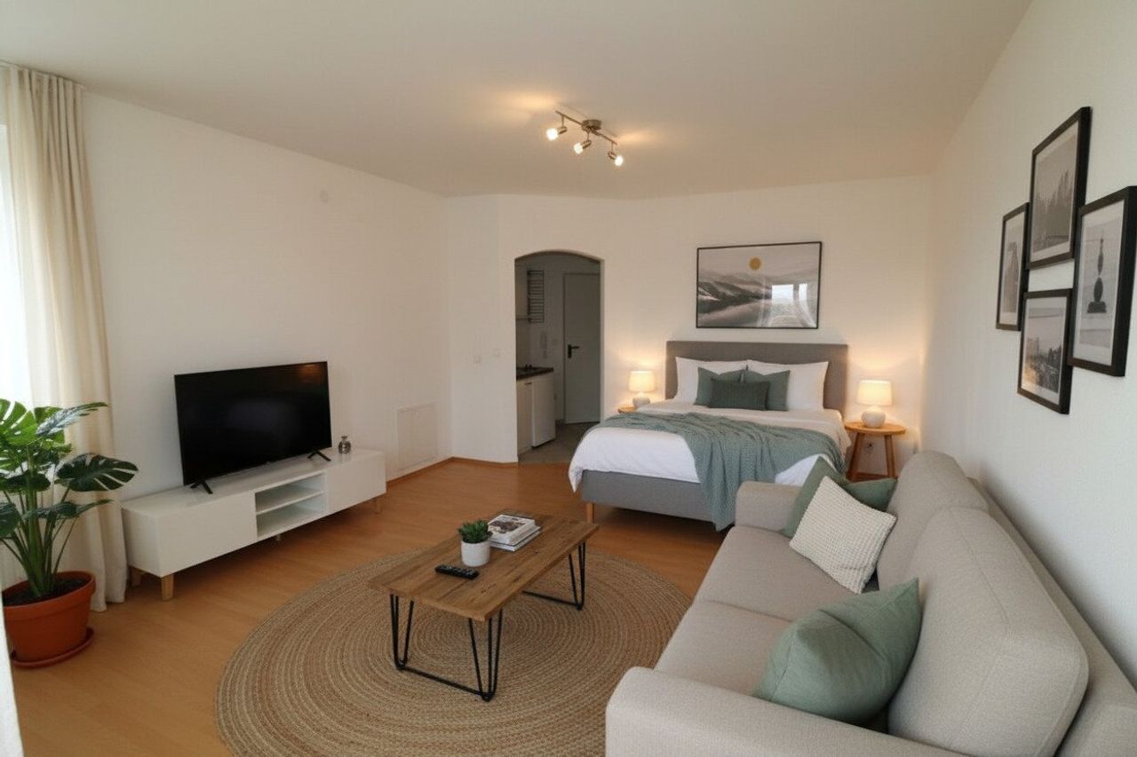 „Die dargestellten Möbel und Einrichtungsgegenstände dienen der besseren räumlichen Vorstellung und wurden mittels KI visualisiert. Sie sind nicht Bestandteil der tatsächlichen Ausstattung der Immobilie.“