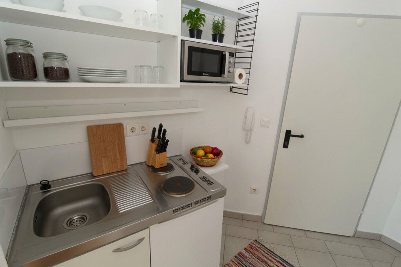 In der Wohnung ist eine Mini-Küche aufgestellt. Diese besteht aus einer Abwasch, zwei Kochplatten und einem Kühlschrank. Ein digitaler SAT-Anschluss ist in der Wohnung vorhanden, ein Telefon-, und Internetanschluss kann hergestellt werden. Die Wohnung wird mit einer Fußbodenheizung beheizt.