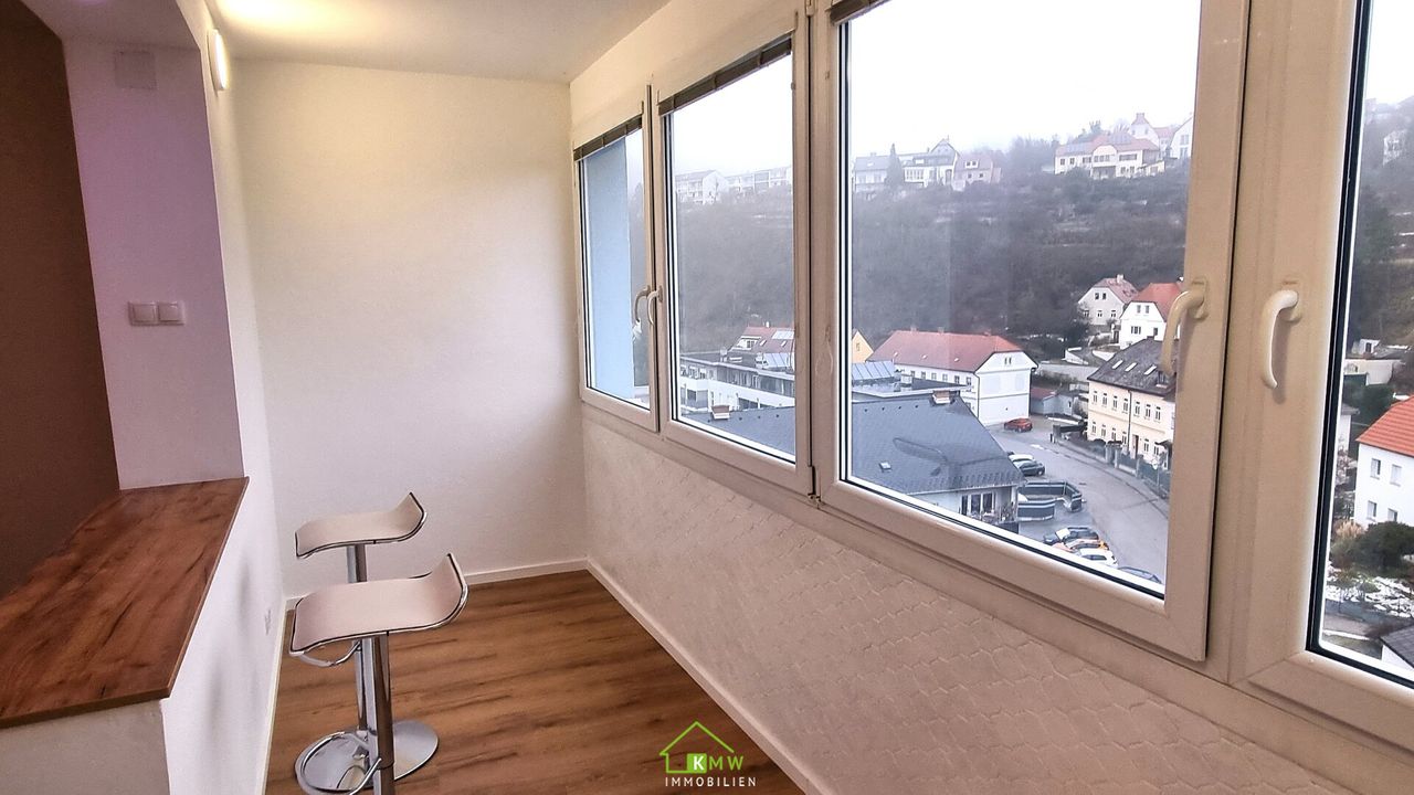 Extras: Blick über Krems im 7. Liftstock, Abstellraum mit Waschmaschinenanschluß, Kellerabteil, eigener KFZ-Stellplatz, usw.
