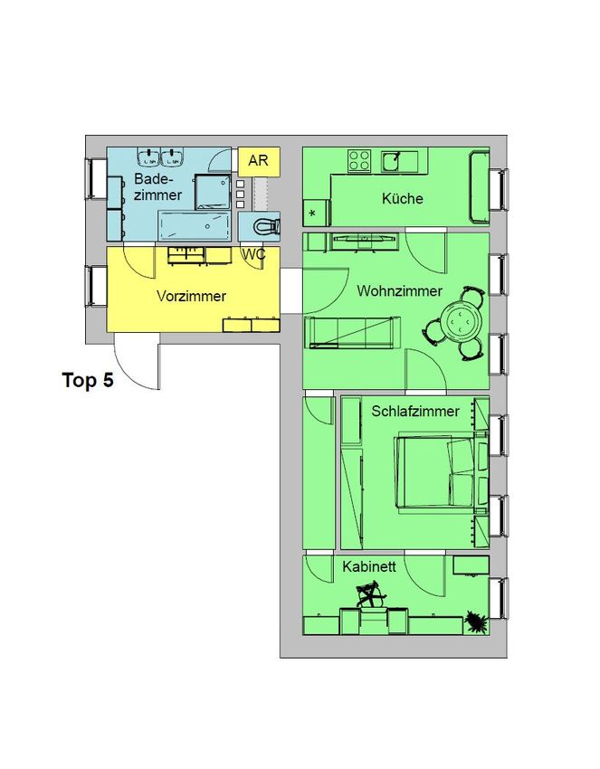 Raumaufteilung: Vorzimmer, 3 Zimmer, Küche, Tageslichtbadezimmer mit Badewanne und Dusche, Toilette, Abstellraum, Innenflur