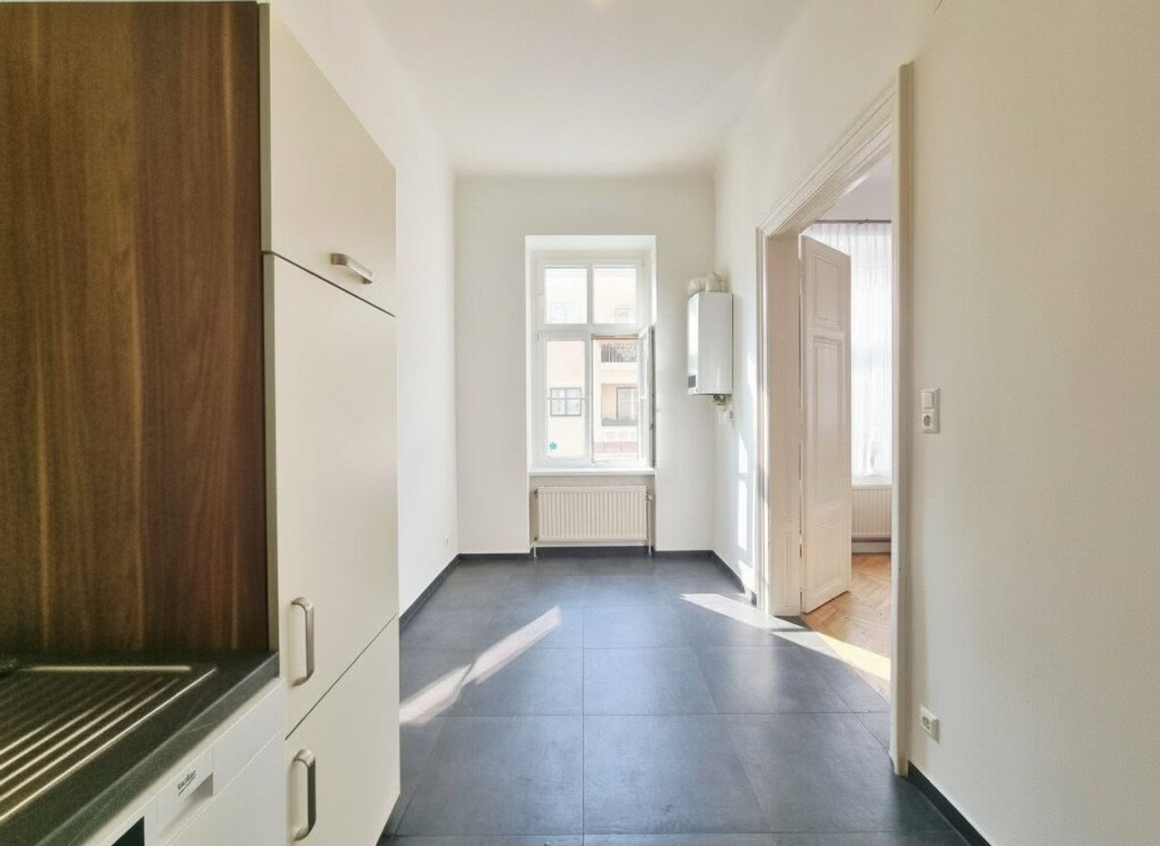 Ausstattung: Hohe Decken mit rund 3,10 Meter, Fischgrätparketten, Stilaltbau Flügeltüren, Kassettentüren und Zargen, Einbauküche
