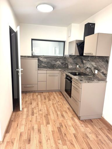 Hochwertige Laminatböden, Fenster und Terrassentüren mit Jalousien sowie eine moderne Küche mit Kühl-/Gefrierschrank, Geschirrspüler, Backofen mit Ceranfeld, Dunstabzug und Spüle unterstreichen den zeitgemäßen Charakter der Wohnung. Beheizt wird mittels Fernwärme, die monatlichen Kosten für Heizung und Warmwasser betragen € 65,00.