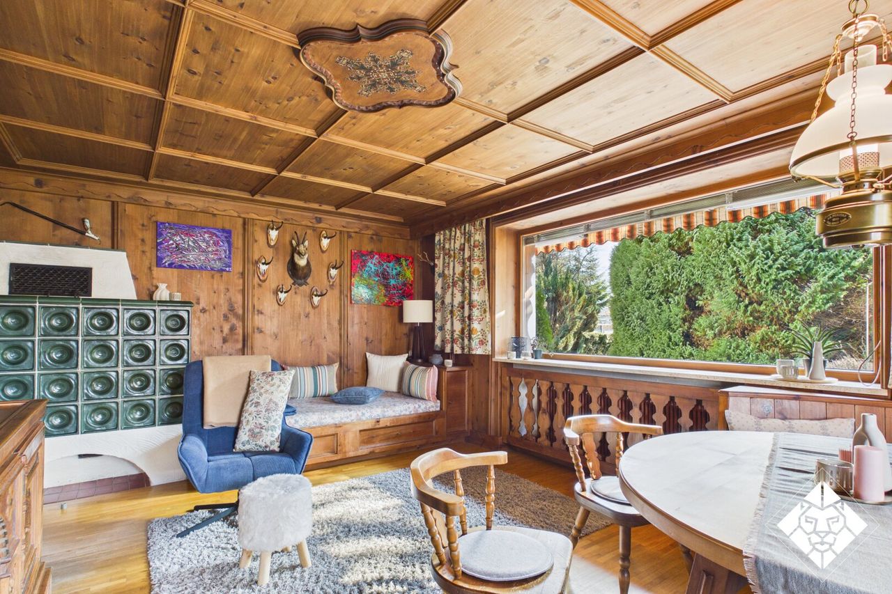 Das Herzstück der Wohnung bildet die großzügige Wohnstube, die mit ihrem traditionellen Flair ein perfekter Ort für gesellige Stunden oder ruhige Abende ist. Der Kachelofen sorgt dabei an kalten Tagen für wohlige Wärme und unterstreicht den alpinen Charakter des Wohnraums.