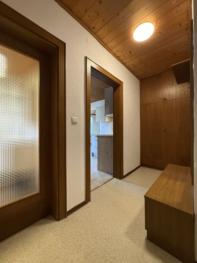 Durch die Holzvertäfelung an den Decken und teilweise an den Wände wirkt die Wohnung sehr einladend und gemütlich.